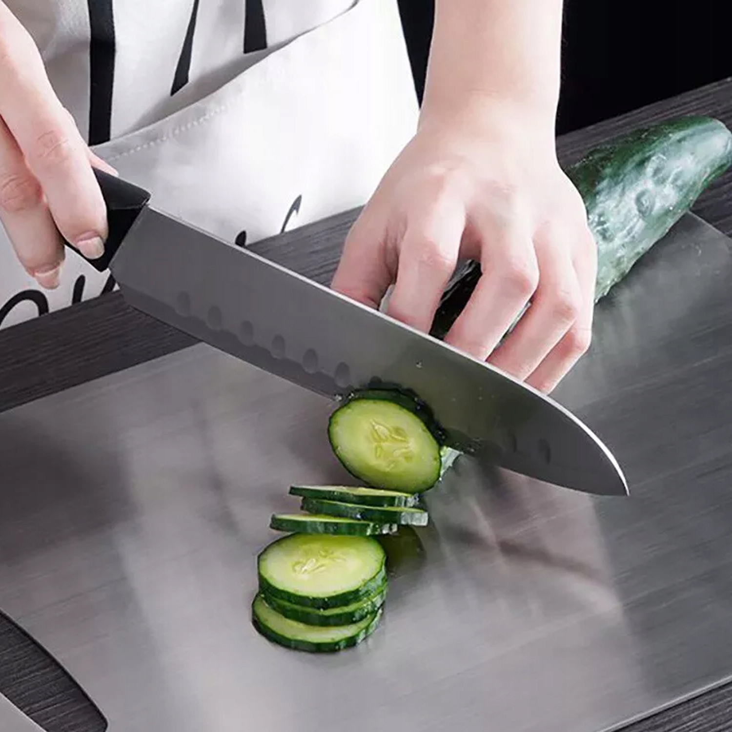 ☑ в отличие от деревянных или бамбуковых досок, на следов нашей доски из нержавеющей стали, канавки или проколов во время повседневного использования и не поглощают жидкости. Это делает его более безопасным и более гигиеничным вариантом для вашей кухни, что значительно уменьшает беспорядок и беспорядок, обычно связанный с другими рубкими досками.