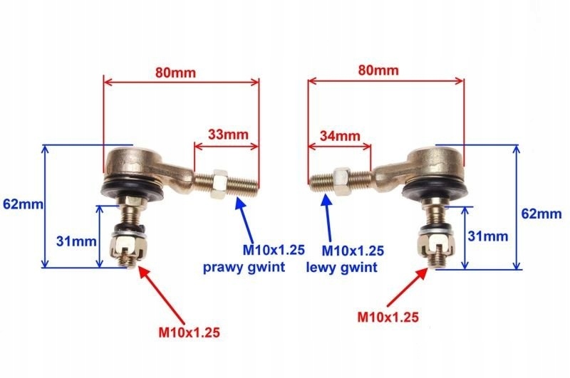 Наконечники рулевой тяги для правой и левой стороны. Один стержень имеет правую резьбу, другой — левую. Поставляется с гайкой и шплинтом.