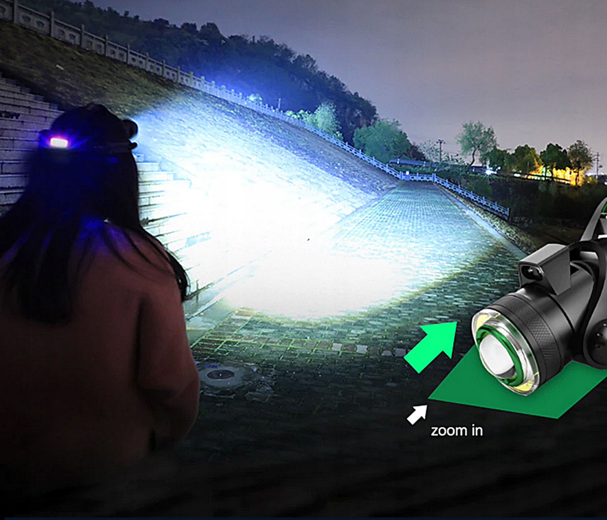 Это позволяет максимально сфокусироваться на одной удаленной точке на расстоянии до 400 м. При максимальном расширении зума свет может достигать диаметра около 3 м при максимальной длине 25 м. Значения зума изменяем перемещением головки фонаря влево или вправо.