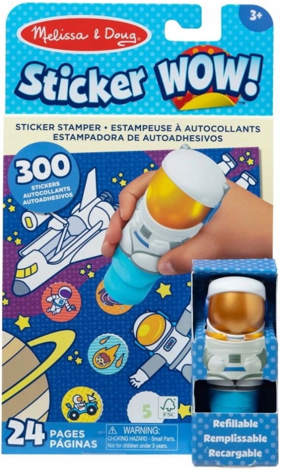 Новинка от бренда Melissa — замечательные книжки со штампами «Стикер Wow», благодаря которым ваши дети смогут приклеить с помощью штампа все, начиная с листов в прилагаемой книге. Просто возьмите специальный штамп в виде забавного космонавта и поместите его на выбранную поверхность.