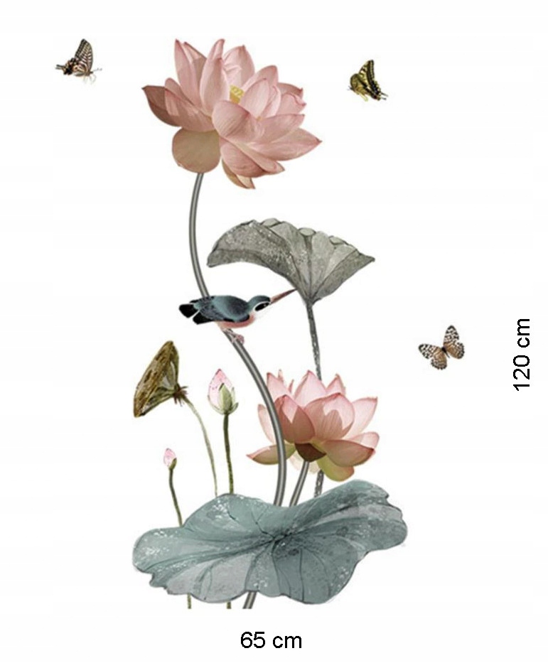 НАСТЕННЫЕ НАКЛЕЙКИ - РОЗОВЫЙ ЦВЕТОК ЛОТОСА, БАБОЧКИ, ГРАФИТОВО-СЕРЫЕ ЛИСТЬЯ