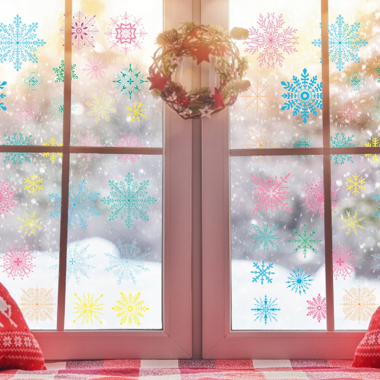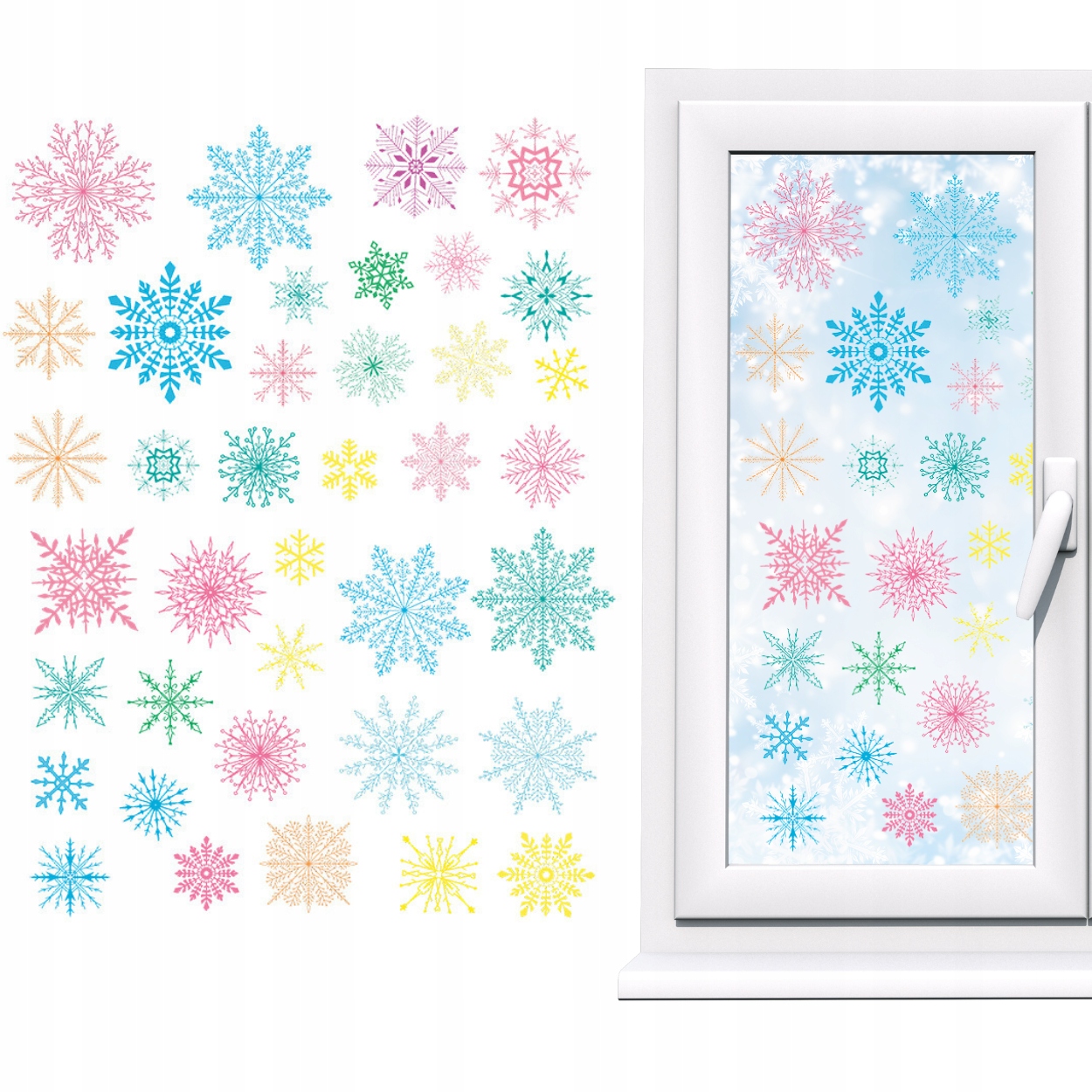 Наши наклейки на окна Разноцветные снежинки идеально подходят в качестве зимнего или рождественского украшения. Благодаря статичным свойствам они не требуют использования клея, что позволяет легко наносить и снимать, не оставляя следов. Их можно использовать многократно, что делает их экономичным и практичным выбором.