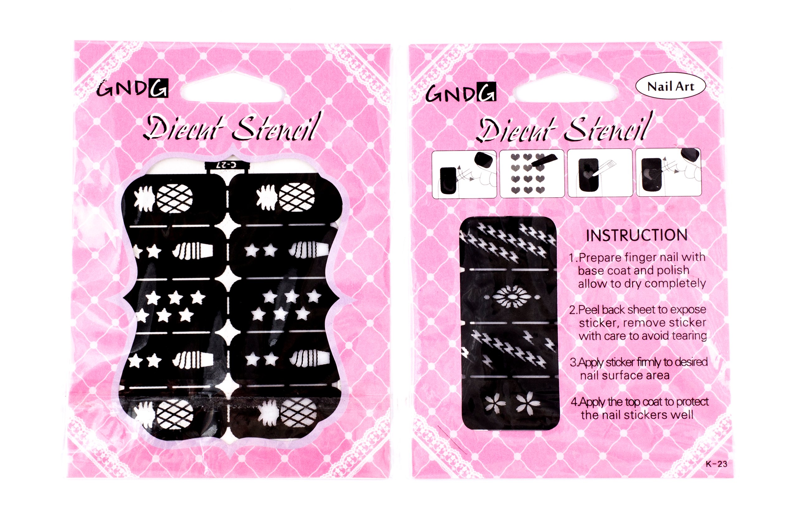 Приклейте шаблон к ногтевой пластине, покрасьте рисунок лаком/краской и снимите шаблон.