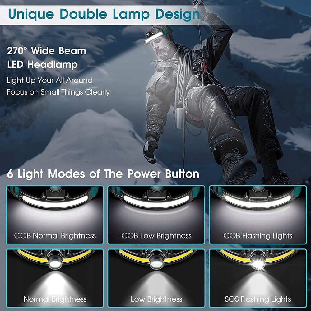 - 6 моделей светодиодных налобных фонарей: аккумуляторную налобную лампу можно легко переключать между 6 режимами освещения: COB LED High, COB LED Low, XPE LED High, XPE LED Low, COB LED XPE LED стробоскопический режим. li>