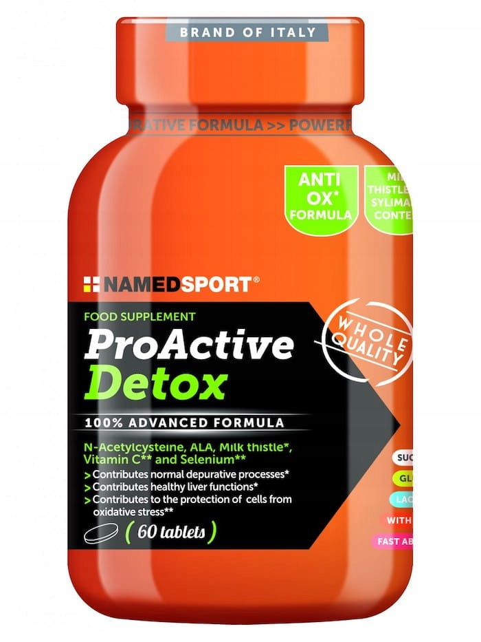 Проактивный детокс -это инновационная формула, основанная на N-ацетилоцистеине, липо кислоте, экстракте окрашивающего молока, селене и наборе антиоксидантных витаминов, разработанных специально для стимулирования функций очистки организма и печени. Проактивная детоксикация особенно полезна в периоды интенсивных тренировок или в случае диеты с высоким содержанием белка. Добавление витамина С поддерживает детоксикацию организма и способствует защите клеток от повреждения, вызванных окислительным стрессом. , Lipos, 200 мг, экстракт рафу молока Moty 125 мг (включая силимарин 100 мг), витамин C 80 мг, селен 28 мкг