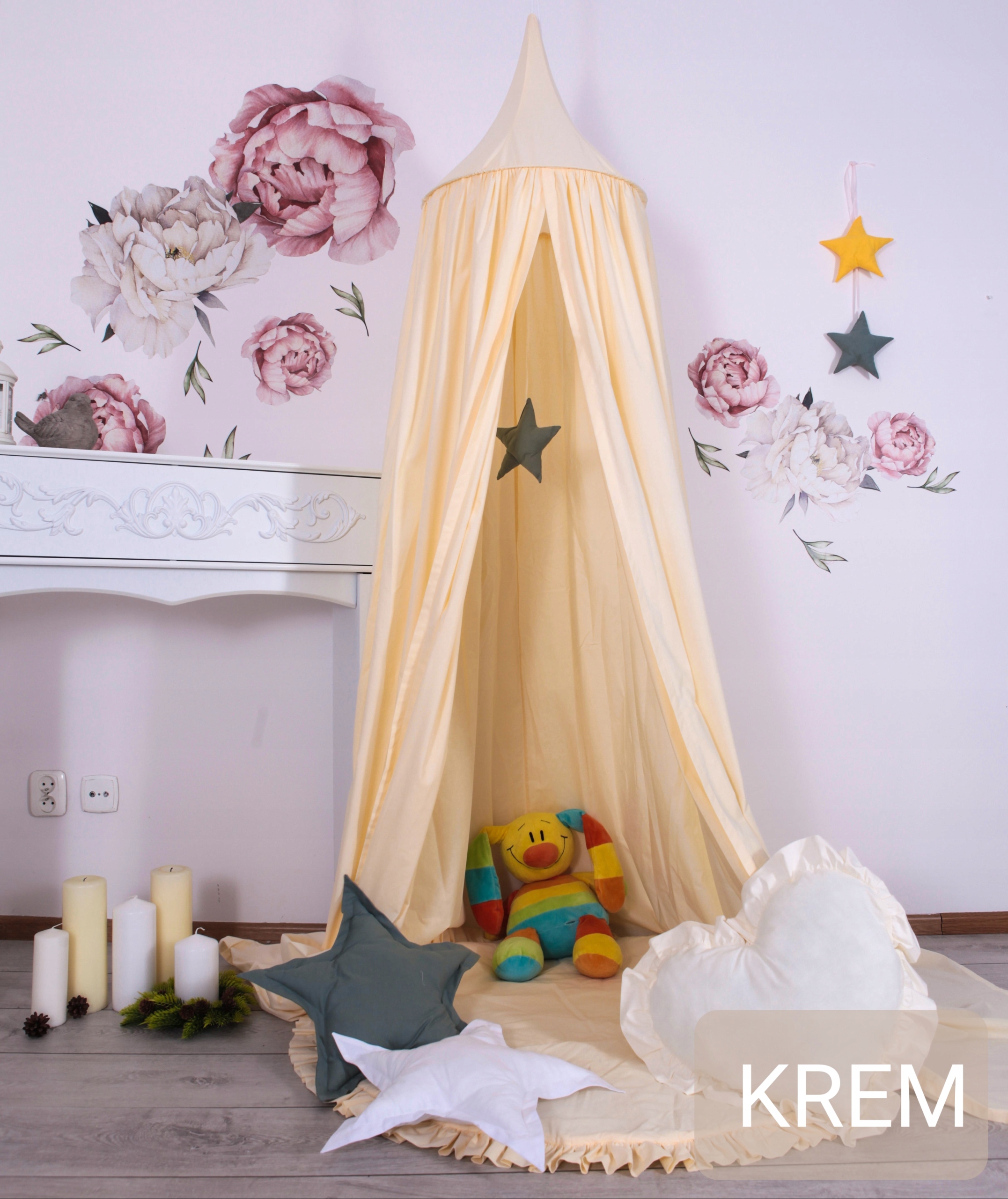 Балдахин – чрезвычайно эффектное украшение детской комнаты, места для игр и отдыха. Подвешенный над детской кроваткой, он приглушит шум и защитит от лишнего света, а в дальнейшем послужит зоной игры и отдыха в комнате дошкольника. Идеально подходит для небольшой комнаты, поскольку не занимает много места. Внутри верха можно прикрепить украшения и декоративные светильники.