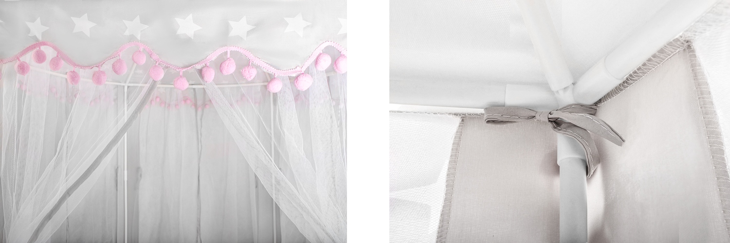 Входы закрыты полупрозрачными легкими шторами, которые идеально сочетаются с остальной частью палатки; гардинки можно повязать или задрапировать декоративными лентами; решение, использованное вместе с бантиками, добавляет шарма и разнообразит веселье.