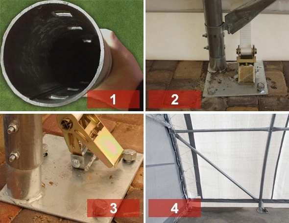 - Крепление анкеров к бетону или мягкому грунту, до трех штук на каждую ногу палатки < /ул>