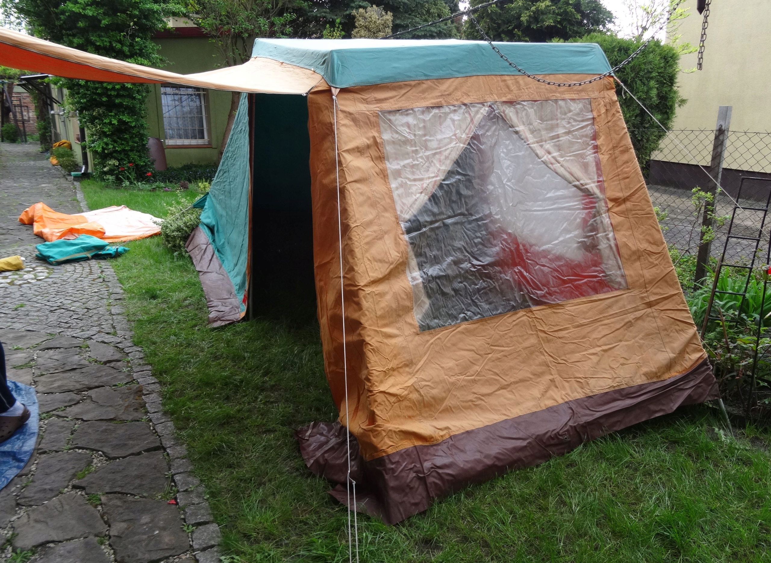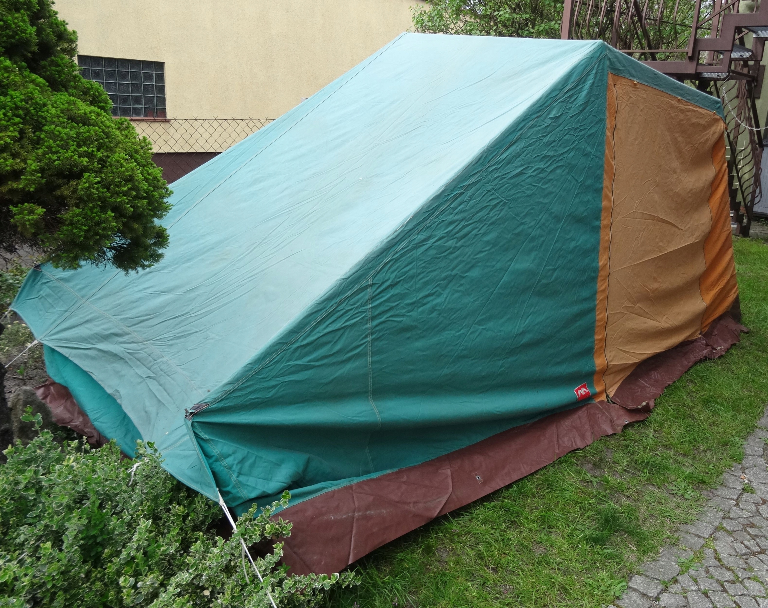 Состояние:б/у, палатка целая, не порвана - полиняла, тент с небольшими загрязнениями, материал спальни со следами влаги, пол целый, каркас целый, кофемашины работают, натяжные резинки изношены от времени. Палатка может потребовать мелкого обслуживания - замены резины и т.п. Состояние на фотографиях.
