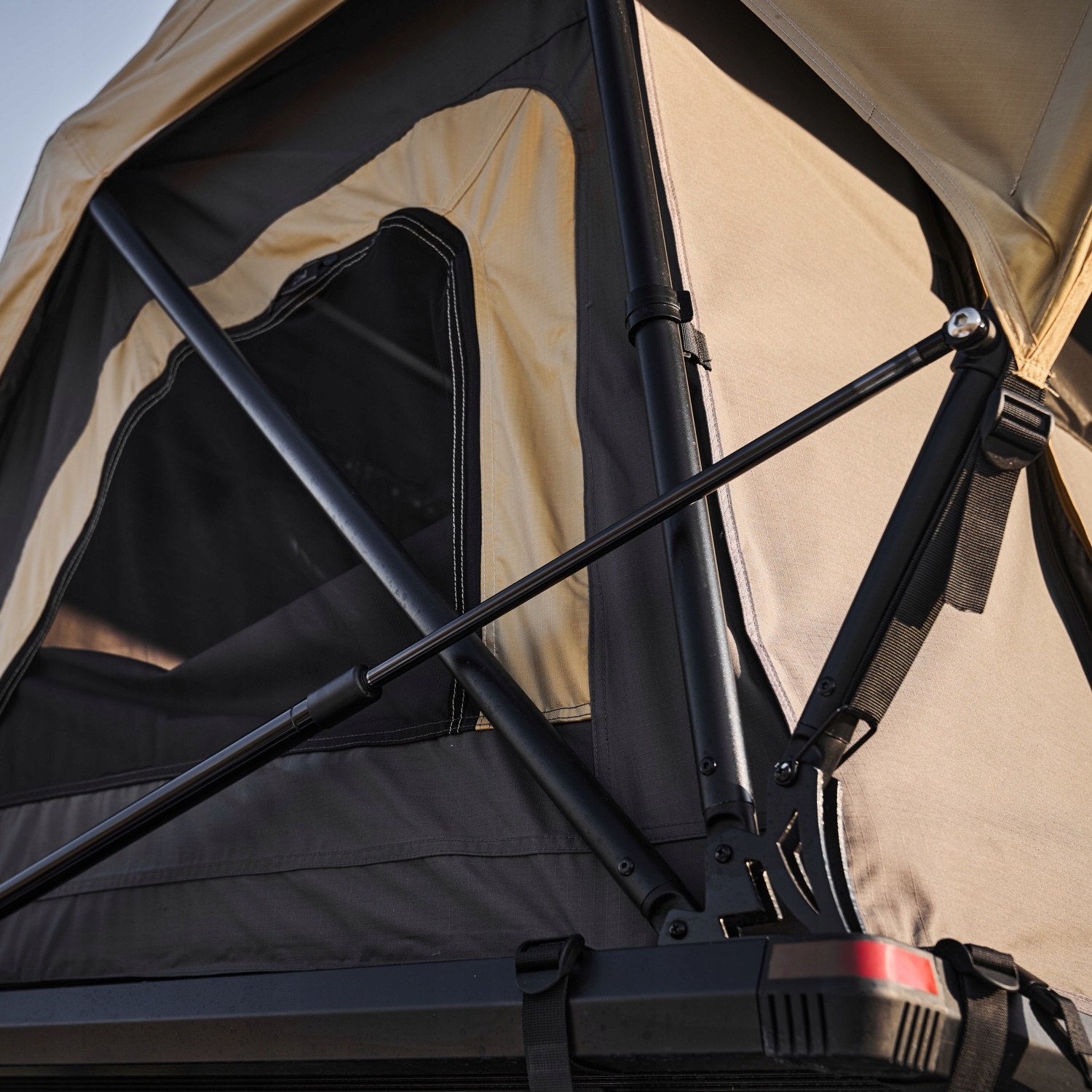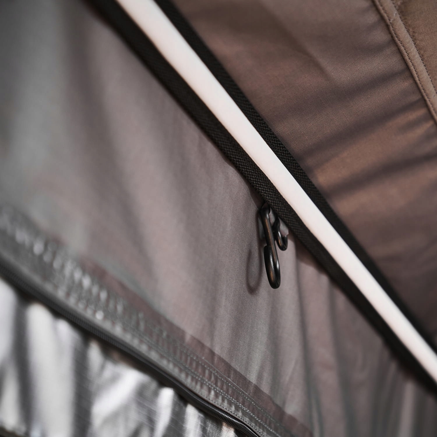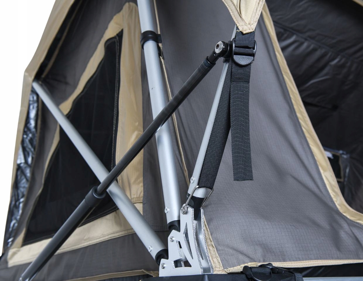 Палатка изготовлена из алюминия, структура рамы долговечна и в то же время чрезвычайно легкая. Вес с лестницей в случае Normanda Auto Pro 120 составляет всего 43 кг . Все элементы алюминия черные, отделаны деликатной структурой .
