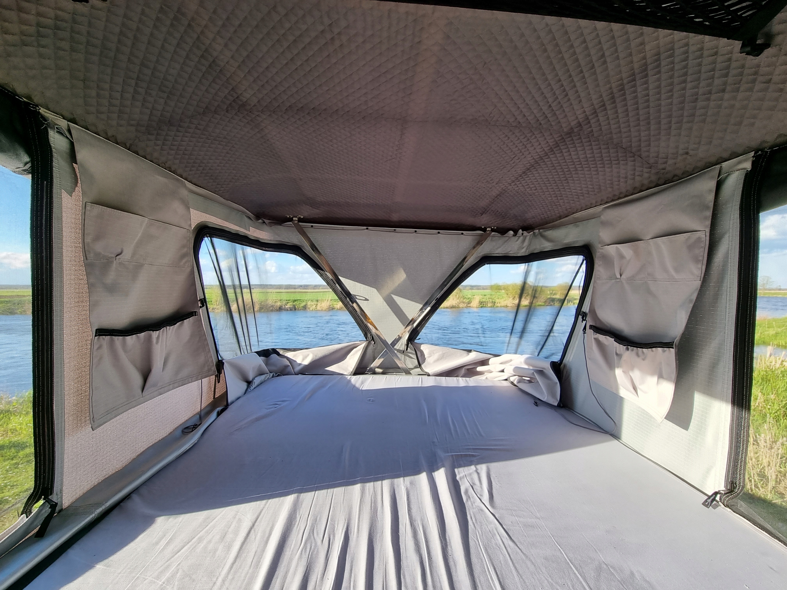 Большим преимуществом спроектированной нами палатки на крыше Outback Prime являются огромные окна, которые можно полностью открыть, наслаждаясь окружающей природой. Палатка достаточно высокая, чтобы человек среднего роста мог легко сидеть в вертикальном положении. В палатке имеется два входа с обеих ее длинных сторон. Каждый входной/оконный проем оборудован москитной сеткой на молнии, а также каждый может быть полностью закрыт, тем самым затемняя пространство внутри. Водонепроницаемая ткань, из которой изготовлена палатка, покрыта изнутри слоем серебра, что делает ее непрозрачной и трудно впитывающей влагу. Все это делает палатку уютной и сухой.