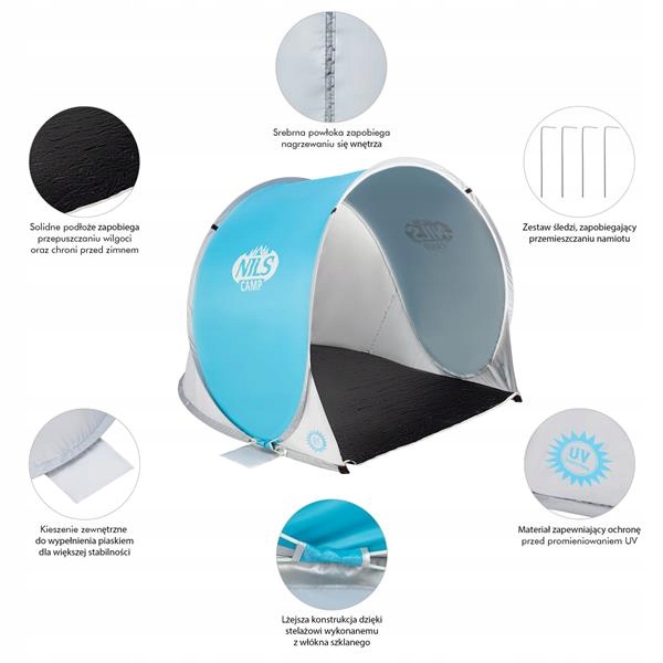 Это саморазвертывающаяся пляжная палатка. Его размеры гарантируют удобство и комфорт использования. Главное преимущество модели NC3173 в том, что она сама раскладывается. Просто выньте его из чехла и положите на землю. Через несколько секунд палатка готова. В результате мы можем быстро предаться блаженному отдыху. Благодаря входящим в комплект колышкам изделие не будет смещаться и нет риска его унести ветром. Дополнительно в палатке есть специальные карманы, которые можно наполнить песком. Они также предназначены для предотвращения нежелательного перемещения палатки.
