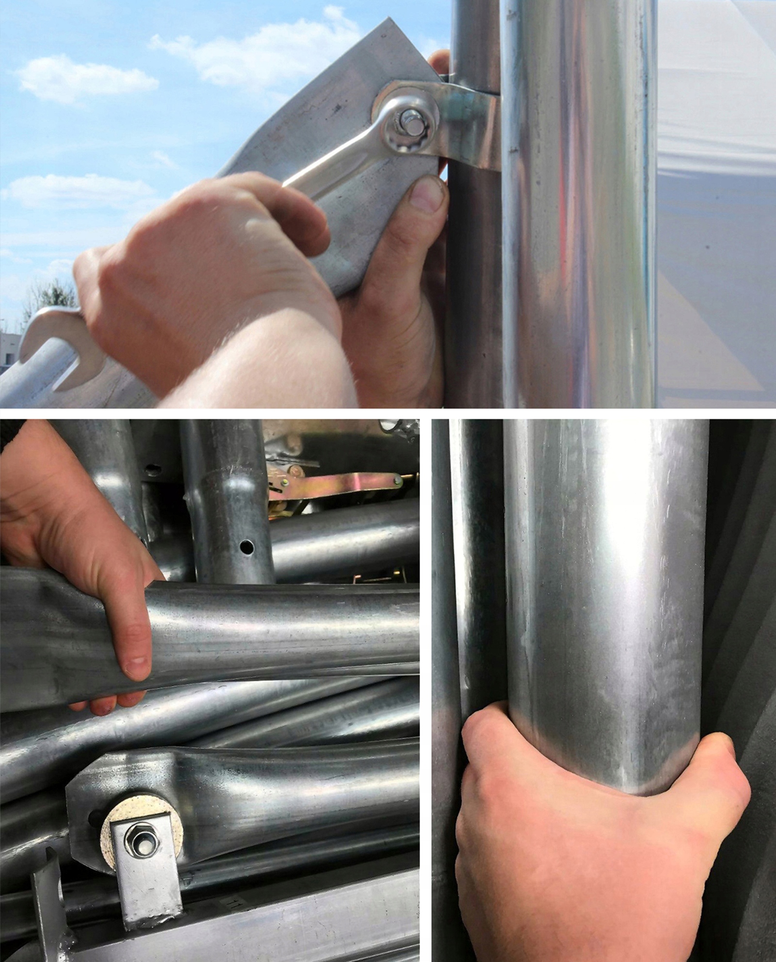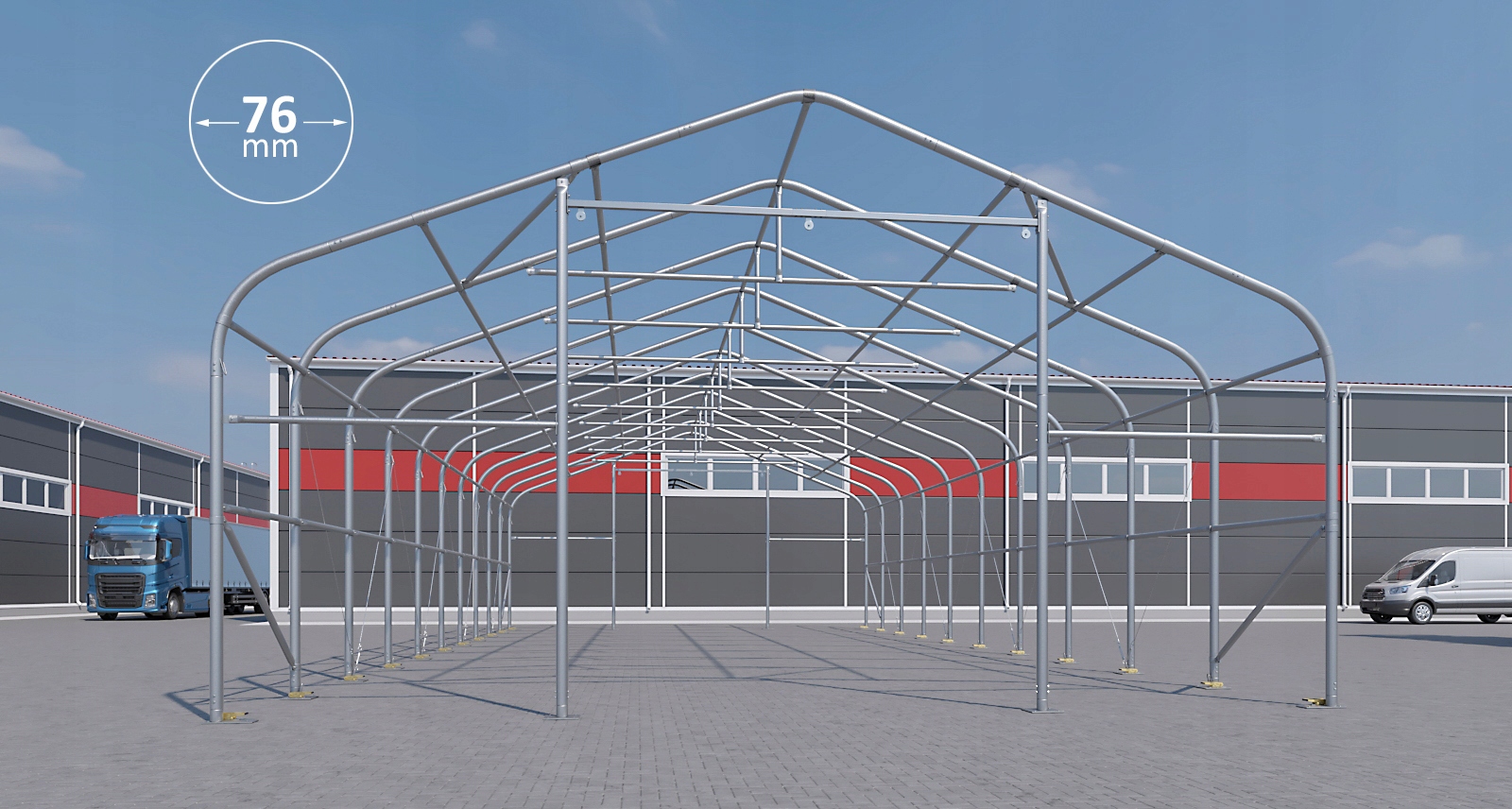 - Усиление передней конструкции — Твердые стальные трубы стабилизируют переднюю конструкцию и в то же время защищают фронтонный брезент.