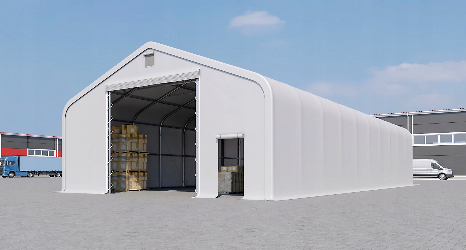 Конструкция, брезент, двускатная стена с большими воротами и входом для людей.