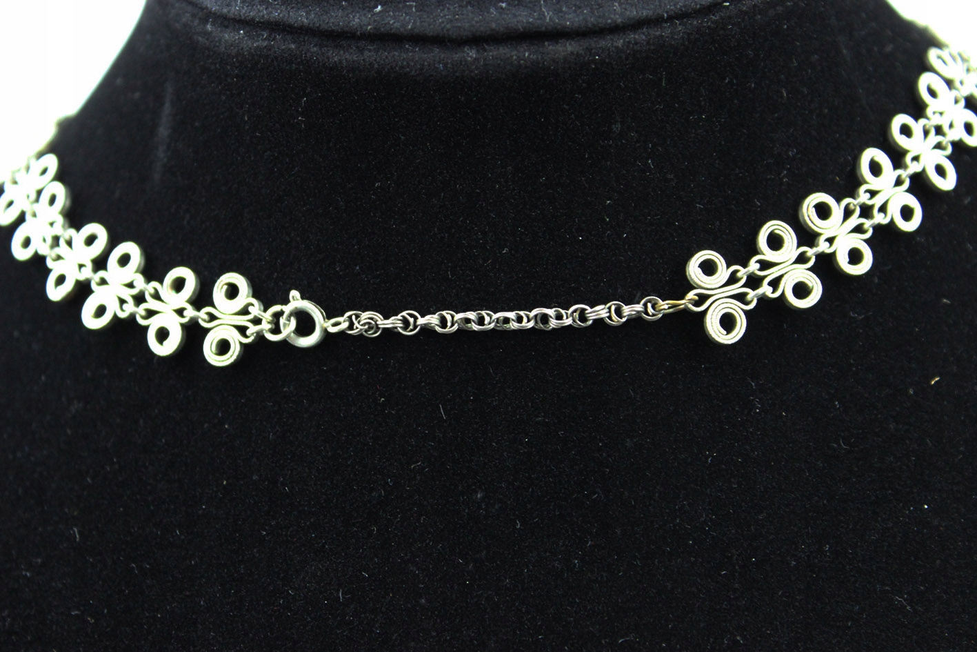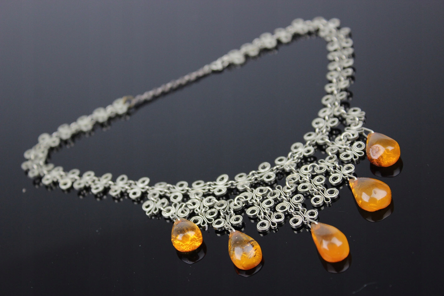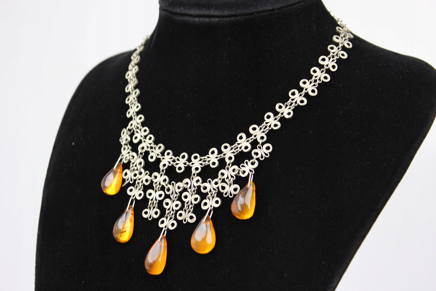 Привлекательное колье из альпаки, декоративной, ажурной формы с мотивом из скрученных вручную проволок, характерным для послевоенного дизайна. Нижняя часть композиции украшена свободно висящими каплями натурального янтаря теплого, медово-коньячного цвета, прекрасно реагирующего на свет. Форма и технология изготовления указывают на изделие 1950–1960-х годов. 20 век.