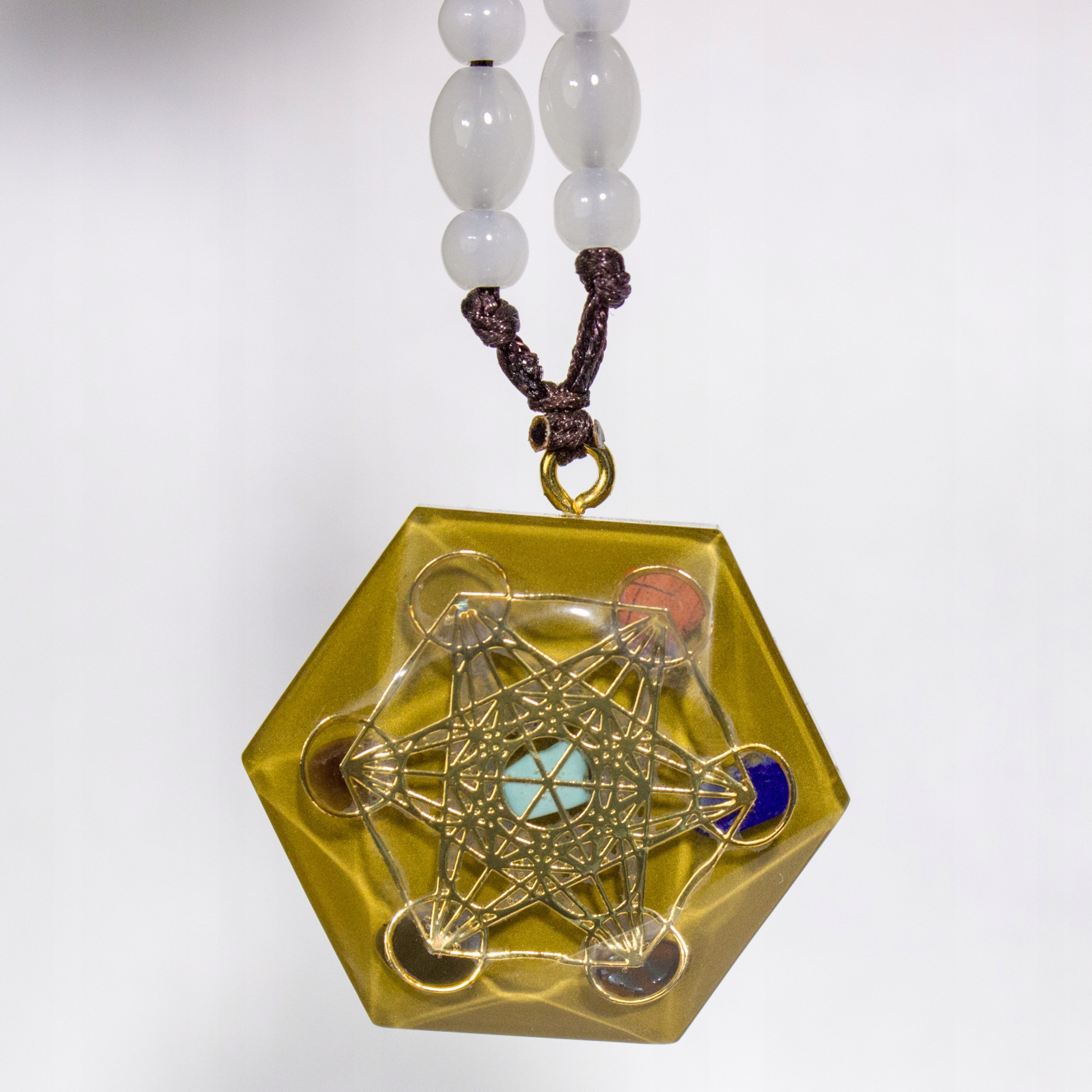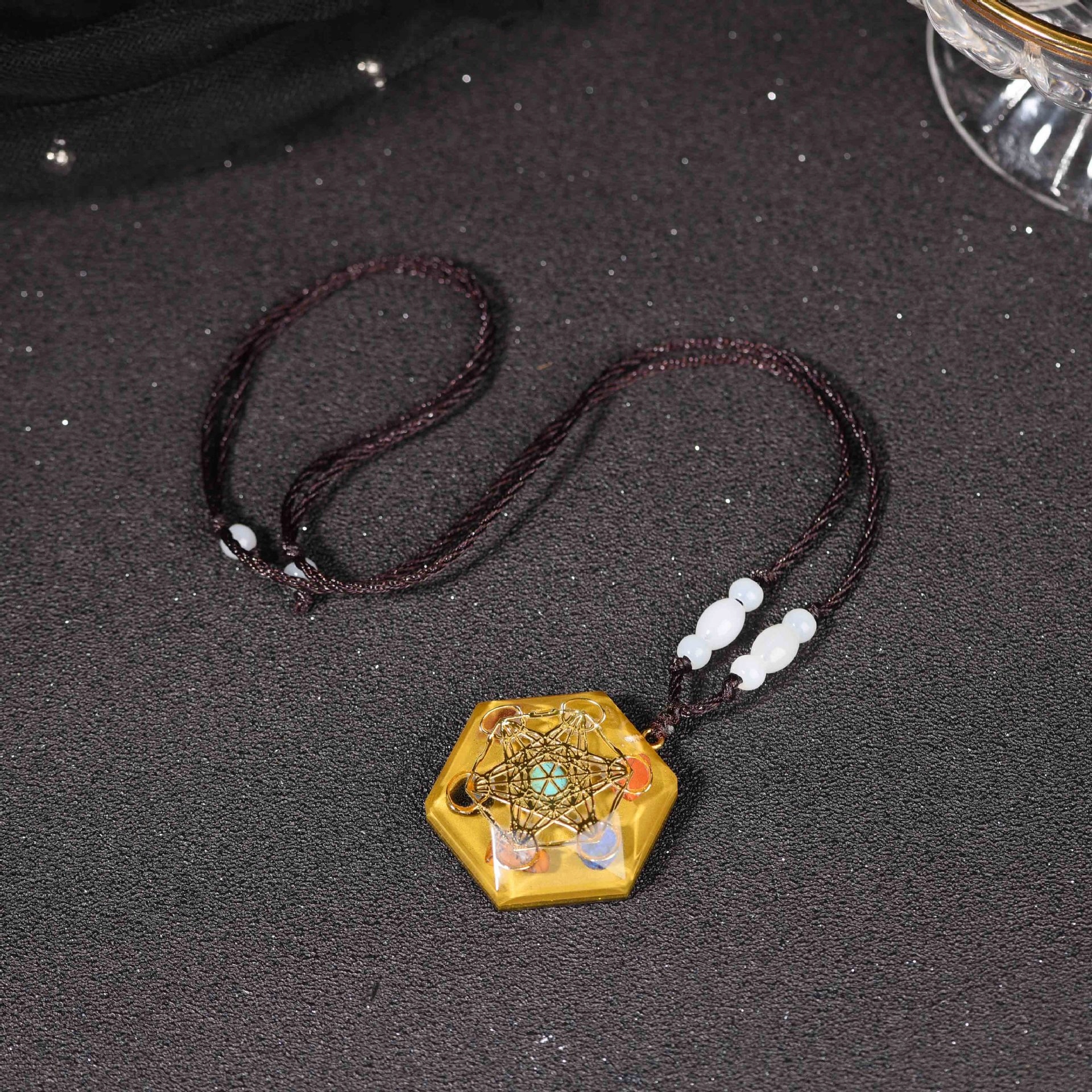 Красивое, красочное колье с камнями Аметист, Бирюза, Лазурит, Тигровый Глаз, Агат, Обсидиан и медная энергетическая дорожка - Куб Метатрона. Шестигранная форма и чудесный темно-желтый цветовой оттенок придают красивый внешний вид.