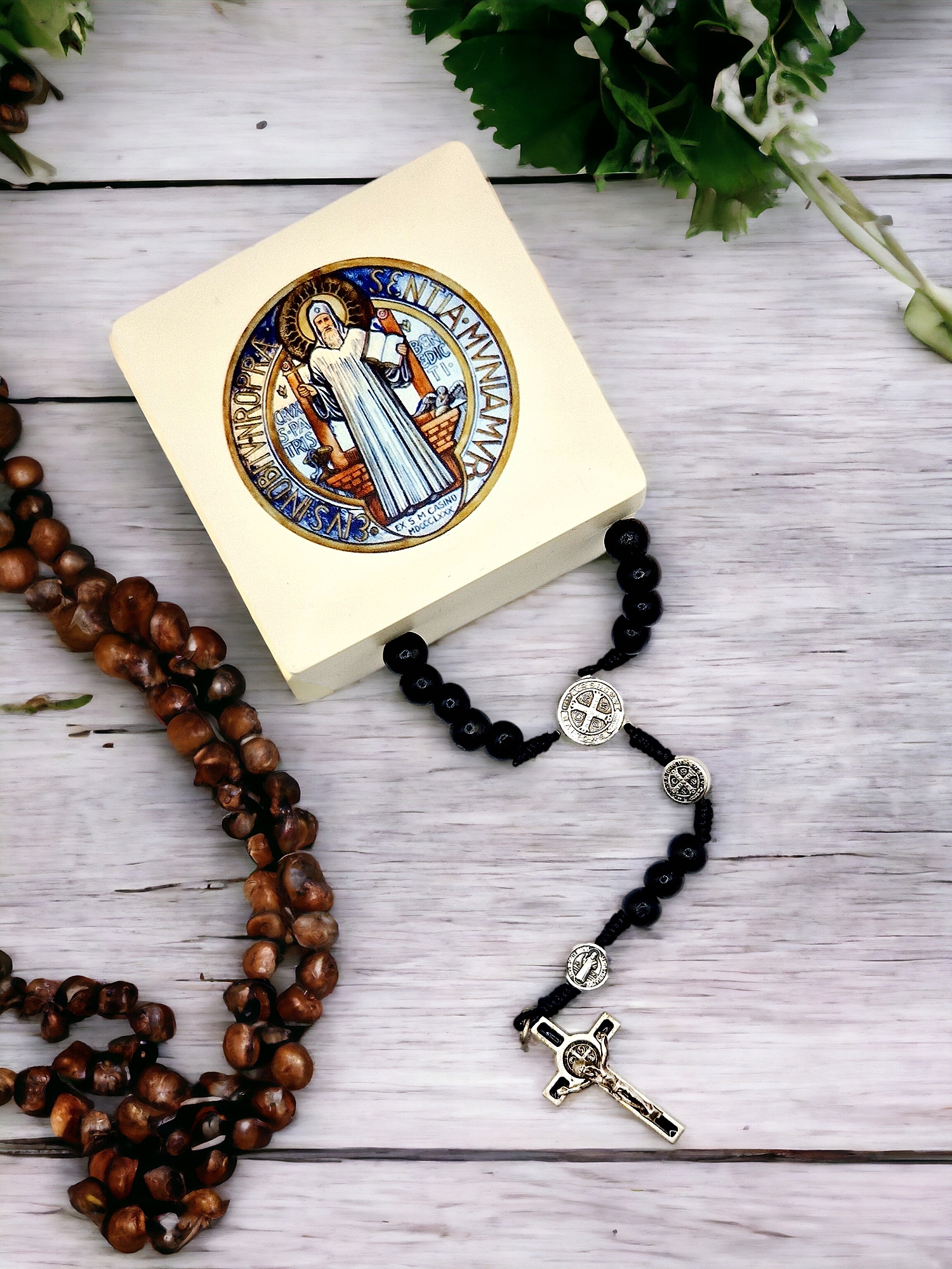 Намисто чотки Святого Бенедикта на плетеній нитці, дерев'яна скринька