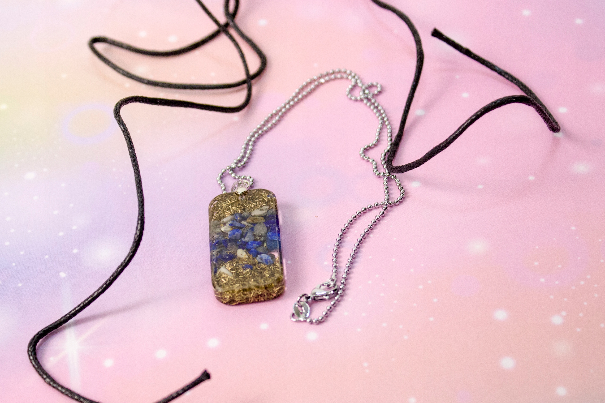 Красивое маленькое золотисто-голубое колье на блестящей цепочке с вощеной веревкой в комплекте; кулон, талисман с лазуритом и медной стружкой - воздействие на все 7 энергоцентров, чакр!!!