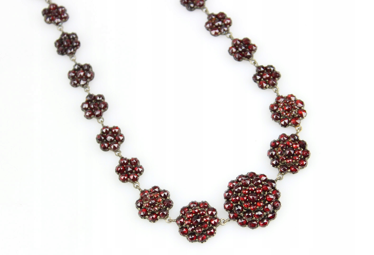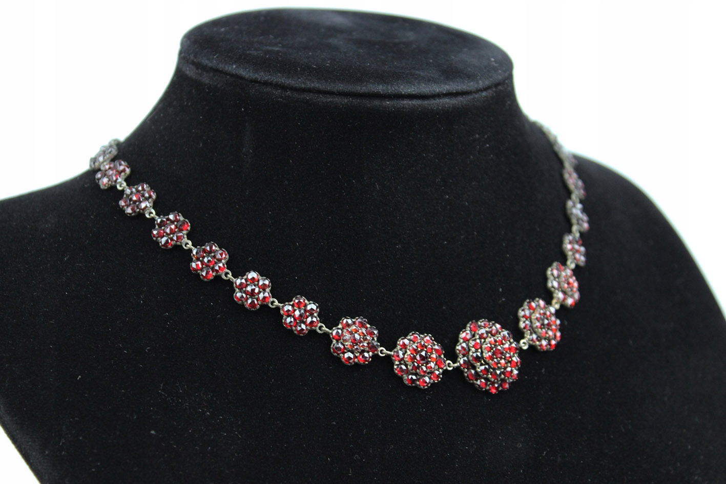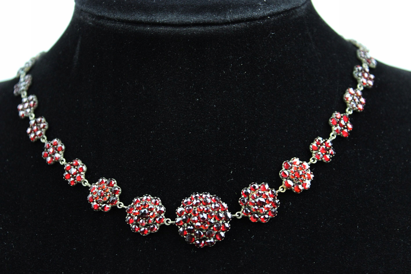 Красивое колье «принцесса», украшенное гранатами. Предмет из Германии или Австрии, изготовленный во второй половине 19 века. Основание из посеребренного томпака с выдвижной застежкой. Натуральные камни огранки «роза». Все в очень хорошем состоянии. Размеры: