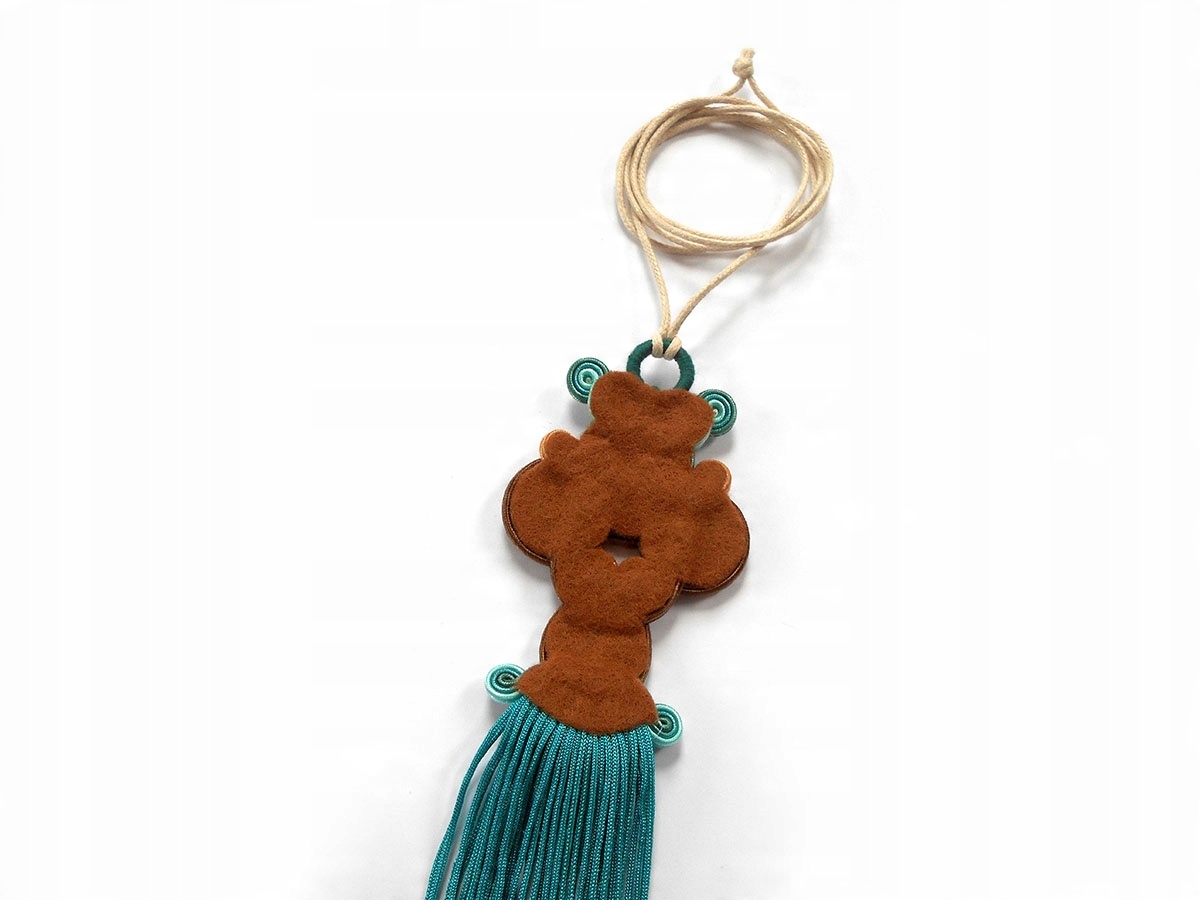 Выполнено из большого количества стеклянных и деревянных бусин, камня бирюзы в центре и перламутра. Подвешен на яркой вощеной веревке. Спинка тщательно отделана тонким фетром, подобранным по цвету. Все пропитано, что во многом защищает от загрязнений.