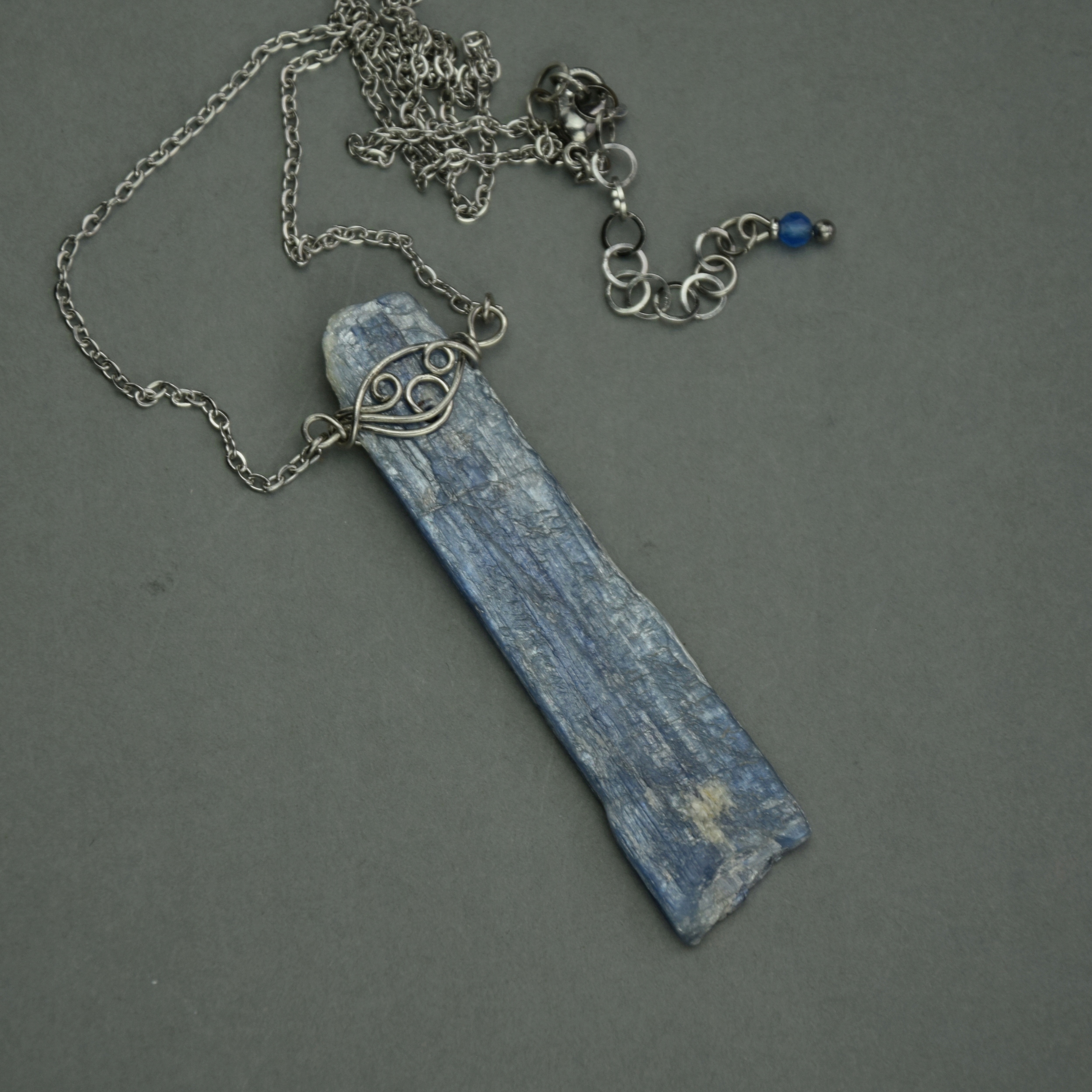 Колье я сделала в технике накрутки из проволок хирургической стали. Колье регулируется, 45-50 см, но длину могу изменить. Размер камня примерно 6,1x1,4 см. Кианит имеет уплощенную форму и толщину около 0,3 см. На конец регулирующей цепочки я повесила шарик из голубого агата.