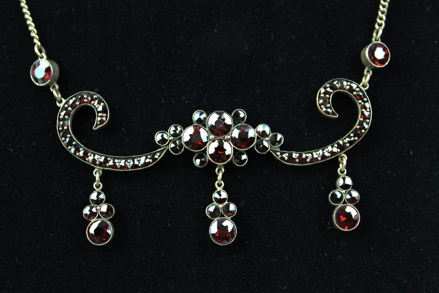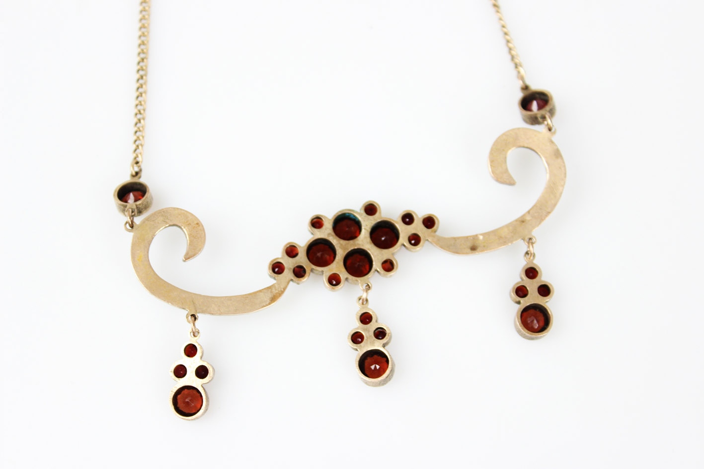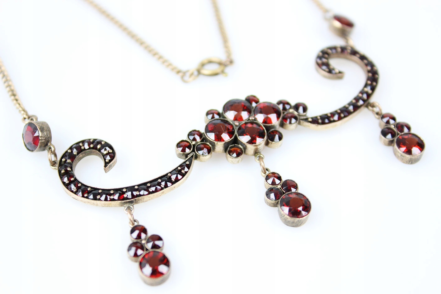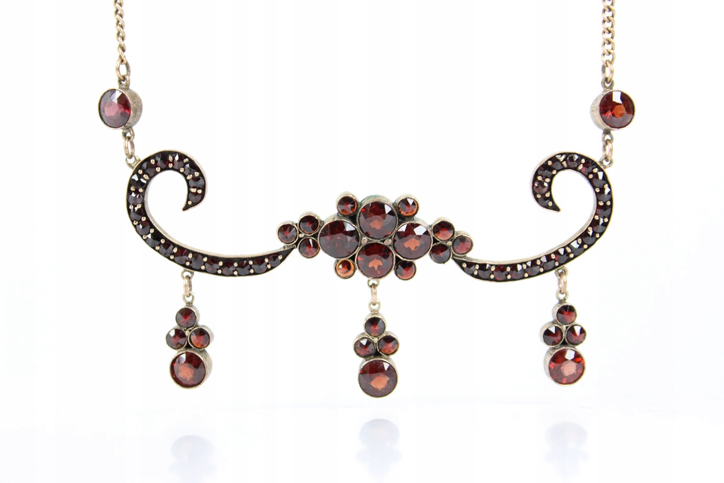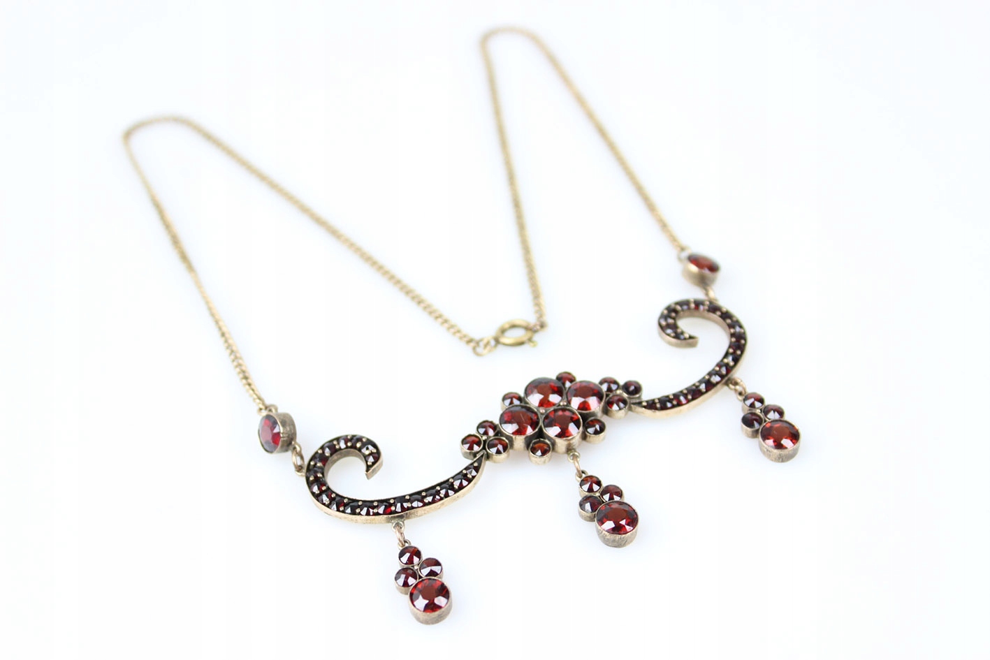 Оригинальное колье 19 века с гранатами. Изделие, которое мягко ложится на зону декольте и привлекает внимание. Товар произведен в Германии или Австрии. Основание из позолоченного томпака, натуральные камни. Все в очень хорошем состоянии. Размеры: