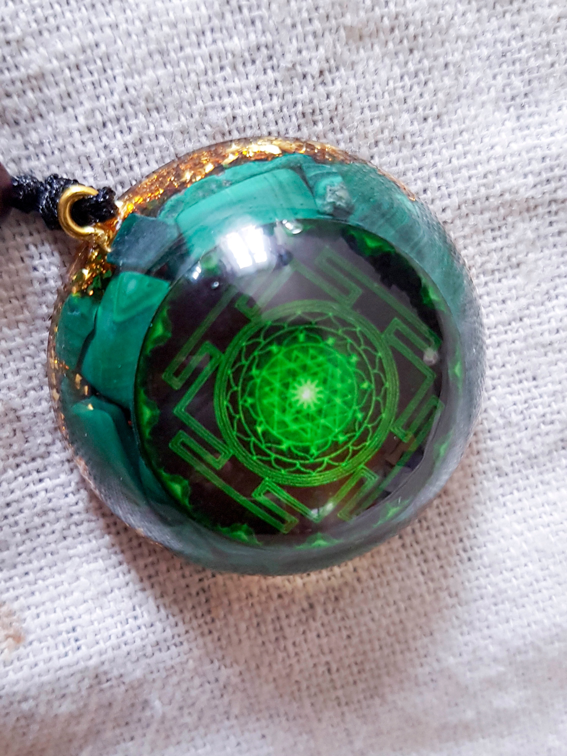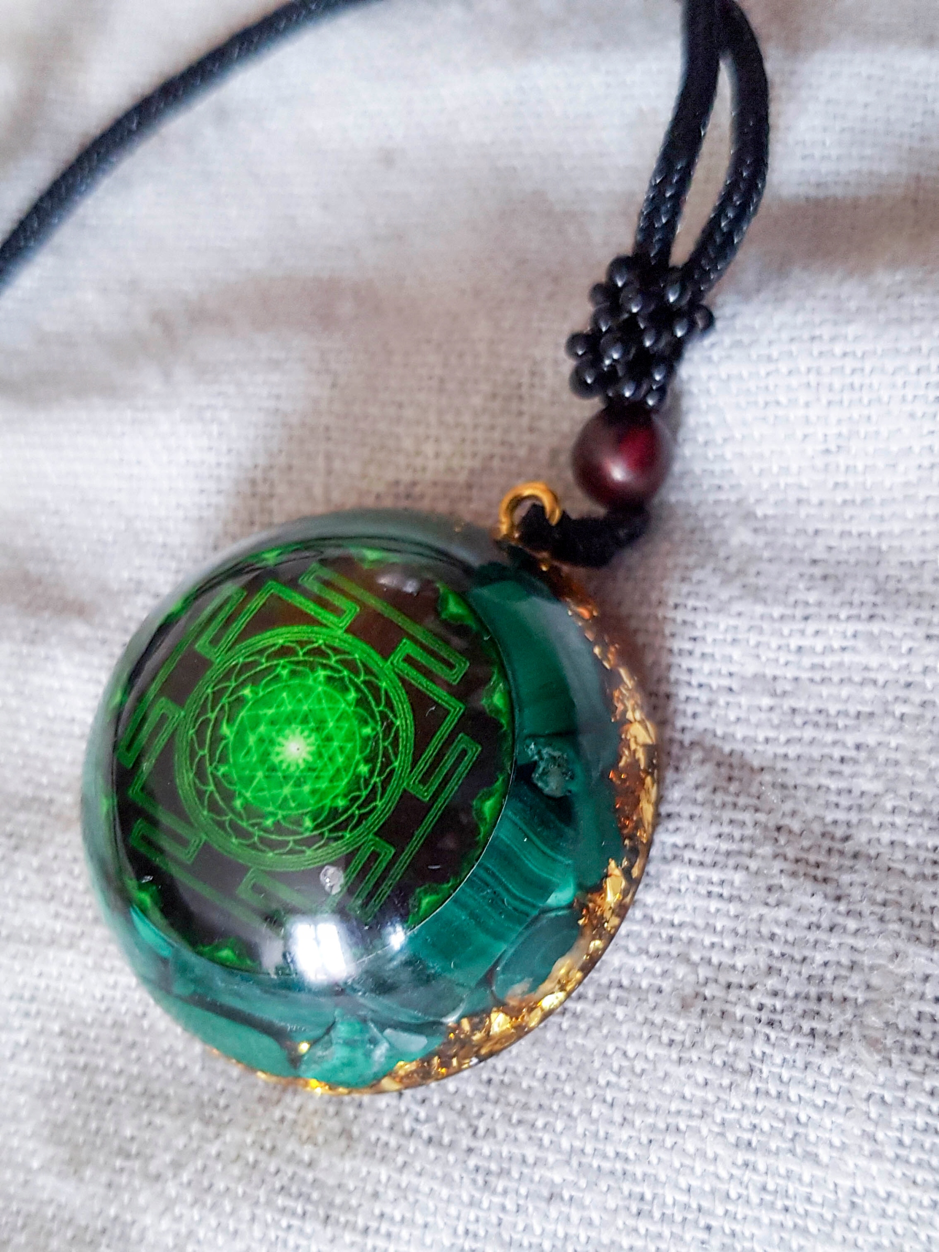 Красивое колье из оргонита с натуральным малахитом и прозрачной стеклянной пластинкой из натуральной смолы - красивый и оригинальный внешний вид, добавляющий положительную энергию в борьбе с болезнями, сильный анти -воспалительное воздействие на все 7 энергоцентров, чакры человека!!!