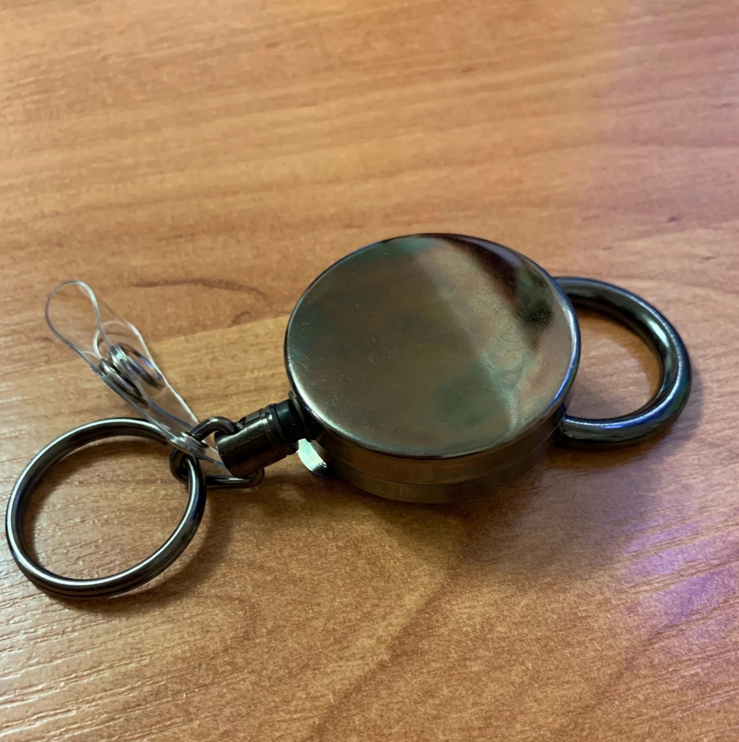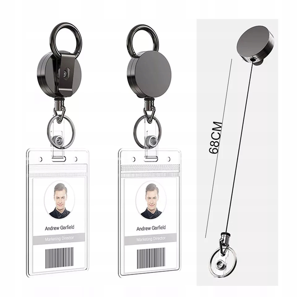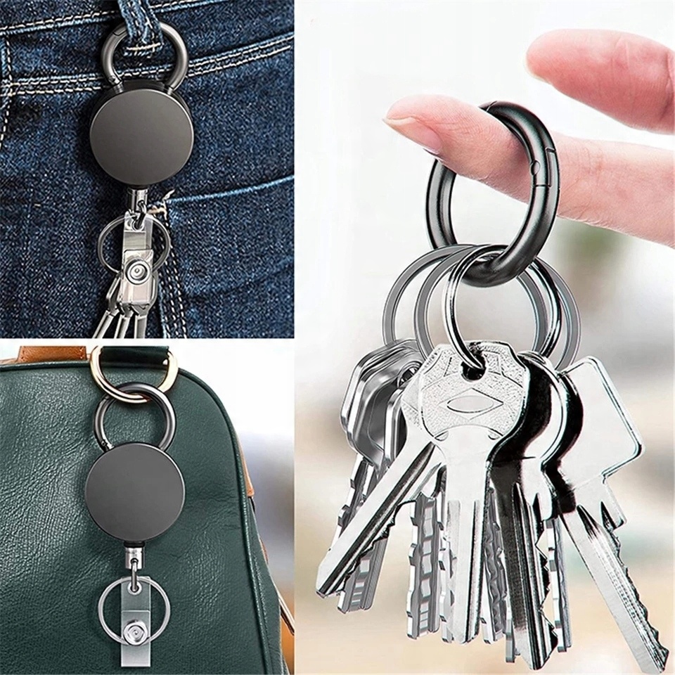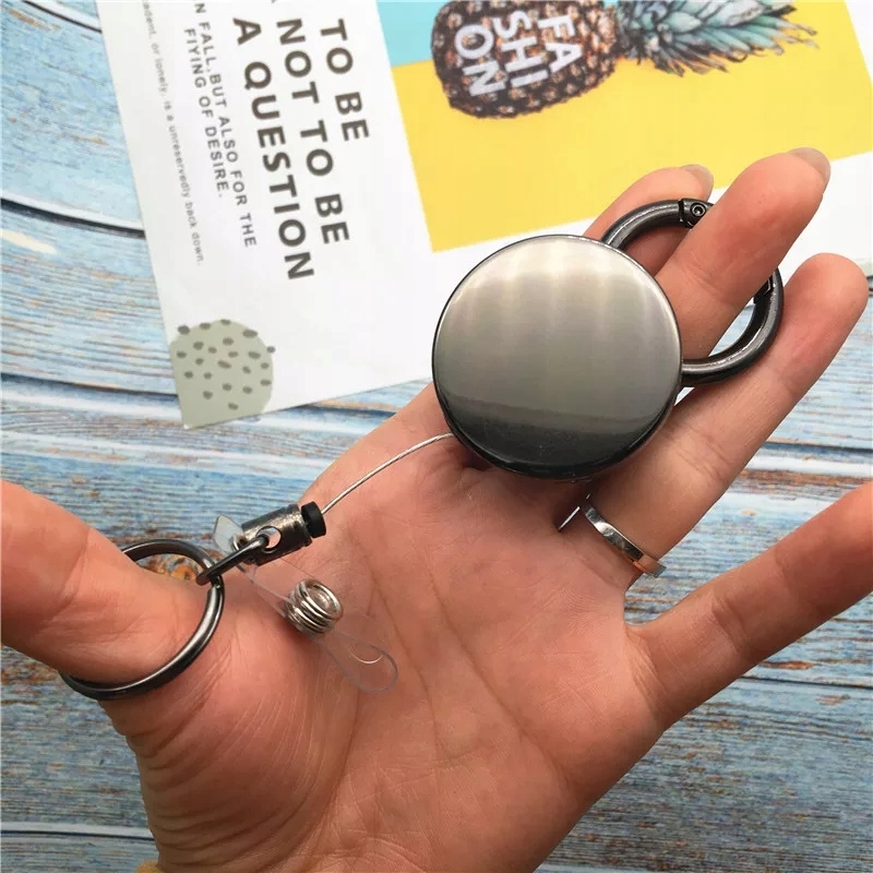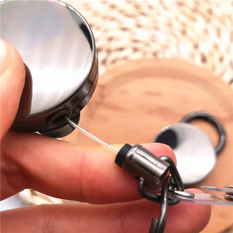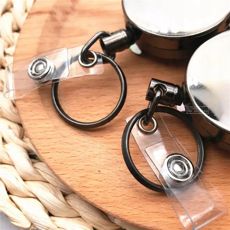 С одной стороны имеется прочное кольцо и крючок для бейджа. С другой стороны находится большой прочный карабин, который можно отсоединить от втягивающего устройства и использовать в качестве брелока.