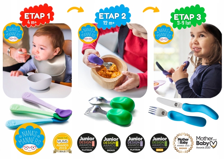 3 этап предназначен для детей от 3 до 9 лет, у которых развивается одновременная координация правой и левой рук во время еды. Специально разработанная форма, размер и вес для детей дошкольного и школьного возраста позволяет им обрести независимость во время еды.