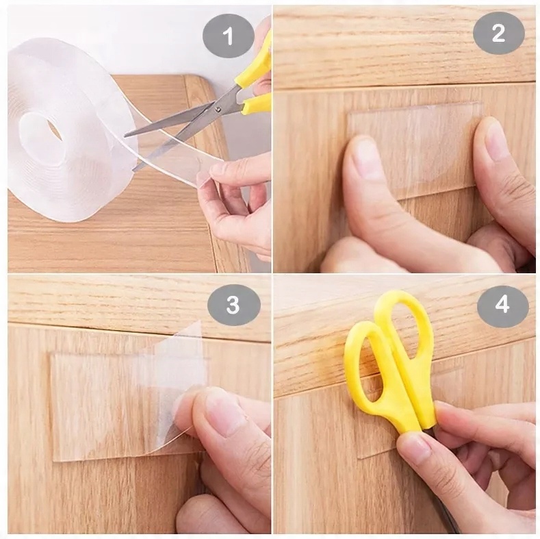 Прозрачный двусторонний скотч – универсальный продукт, имеющий множество применений. Прилипает практически к любой поверхности, растягивается - адаптируется к форме предметов, водостойкий, можно промывать под водой, многоразовый. Имеет структуру, похожую на мягкий пластик или гель - очень прочно прилипает к предметам, но после снятия не оставляет следов и может быть отклеена, когда в этом нет необходимости.