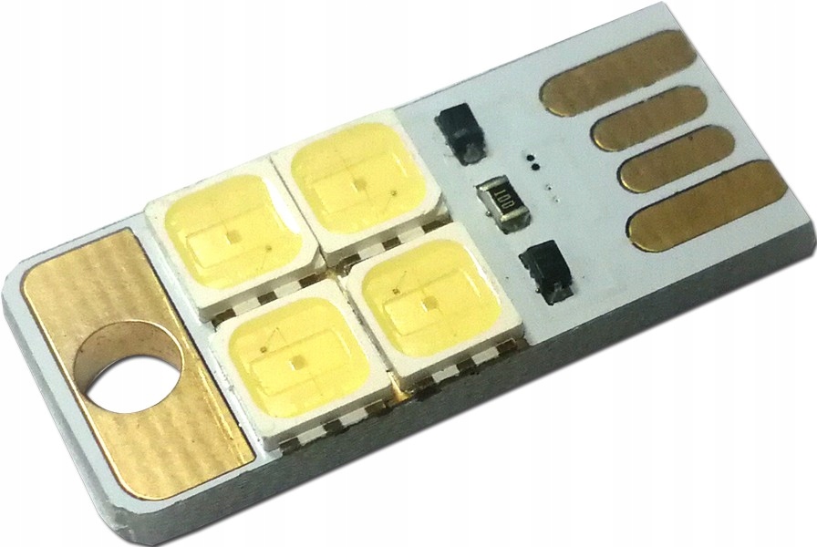 Фонарик, лампа для USB-порта, чуть больше самого порта. Лампа имеет форму печатной платы, вставленной в порт таким образом, что она выступает наружу примерно на 1 см. Четыре очень ярких, даже ослепляющих светодиода генерируют много света.