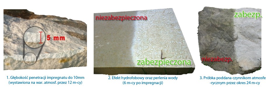 Сшивка кремниевых связей внутри защищаемой поверхности дополнительно укрепляет структуру так называемого процесс консолидации. Глубокая пропитка гарантирует долговременную защиту от проникновения дождевой воды, застоявшейся воды, химикатов и других загрязнений, благодаря чему защищаемые поверхности становятся более прочными и устойчивыми к загрязнениям. Гидрофобизация внутри поверхности продлевает срок службы и долговечность пропитанного камня или бетона, особенно осенью и весной, когда температура в течение дня поднимается и опускается ниже 0 oC.
