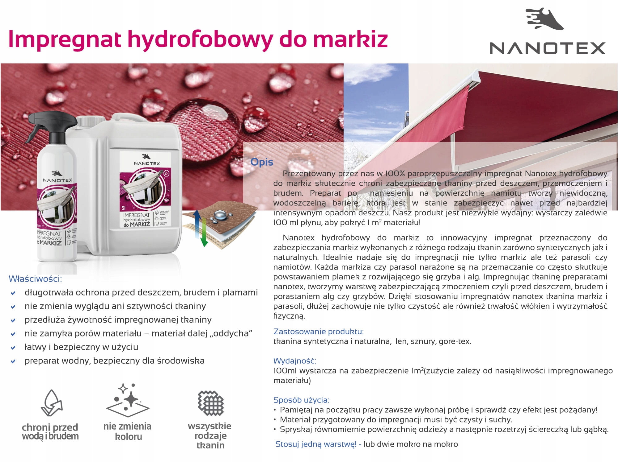 пропитывая ткань приготовлением нанотекса, мы создаем слой, защищающий с помощью смачивания, то есть от дождя, грязи и роста водорослей или грибов. Благодаря использованию нанотексов, ткани, ткани, он поддерживает не только чистоту, но и долговечность волокон и физическая сила