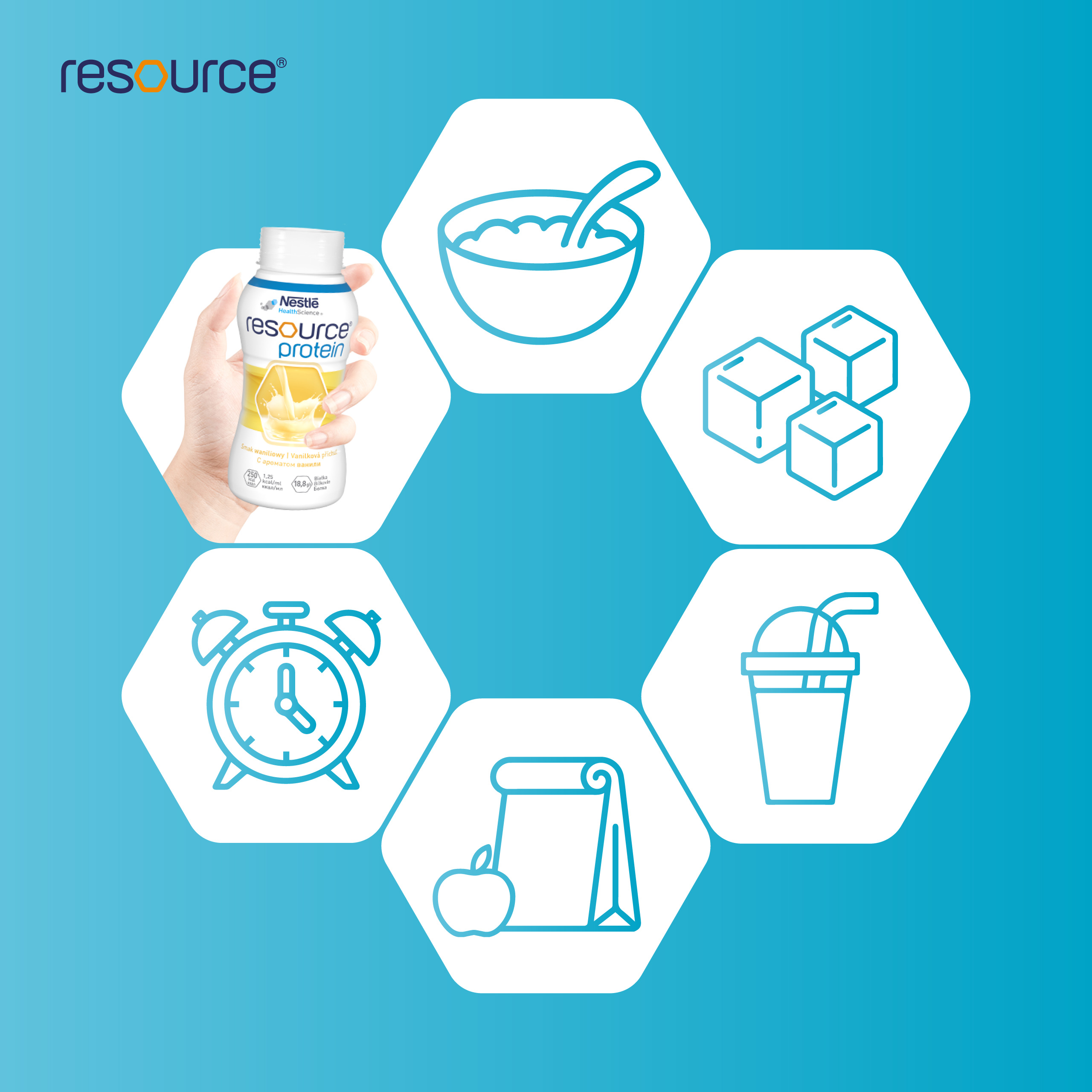 Откройте для себяспециализированныйy питательный препаратResource Proteinванильсо вкусом, которыйполный в виде питательной жидкости с высоким содержанием белка. диета