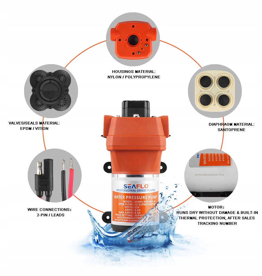 Насос серии Seaflo 41 обеспечивает высокий расход воды при сокращенном рабочем цикле благодаря встроенной четырехкамерной диафрагме. Он обеспечивает производительность 17 литров в минуту, является самовсасывающим и поднимает воду на высоту до 1,8 метра. Может высохнуть на короткое время. Имеет встроенный манометрический выключатель, который автоматически срабатывает при открытии и закрытии крана. Предназначен для работы в системе с количеством подключений до 5.