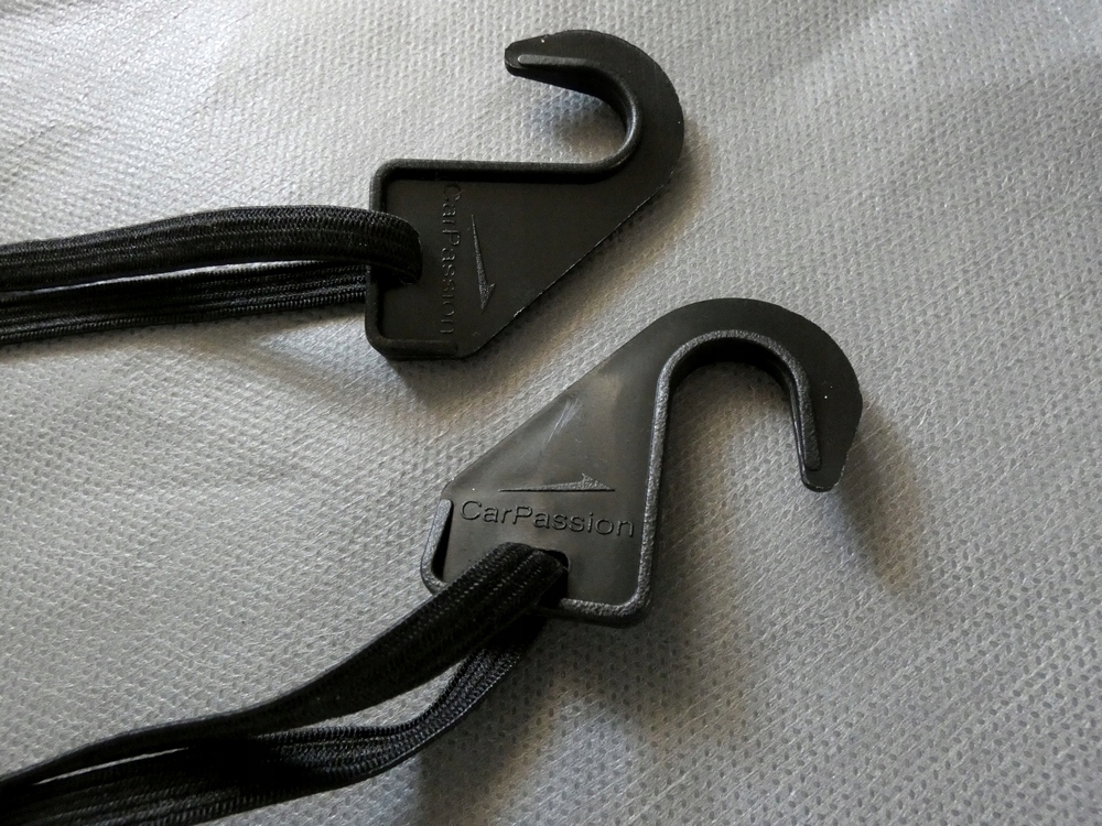 - Просто зацепите гибкие петли чехла безопасными крючками за колесные диски, нижний край в средней машине и нижний край заднего бампера.