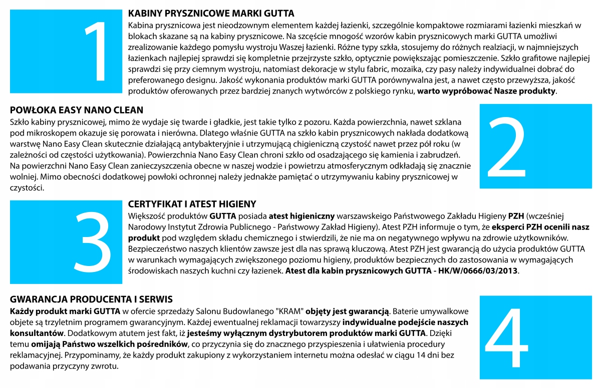 Представляем Вам красивую и функциональную душевую кабину известного бренда Gutta, эксклюзивным дистрибьютором которого мы являемся в Польше уже 18 лет. Стеклянная кабина с безопасным стеклом, раздвижная с хромированными деталями и профилями, для всех, кто ценит комфорт и классическую красоту.