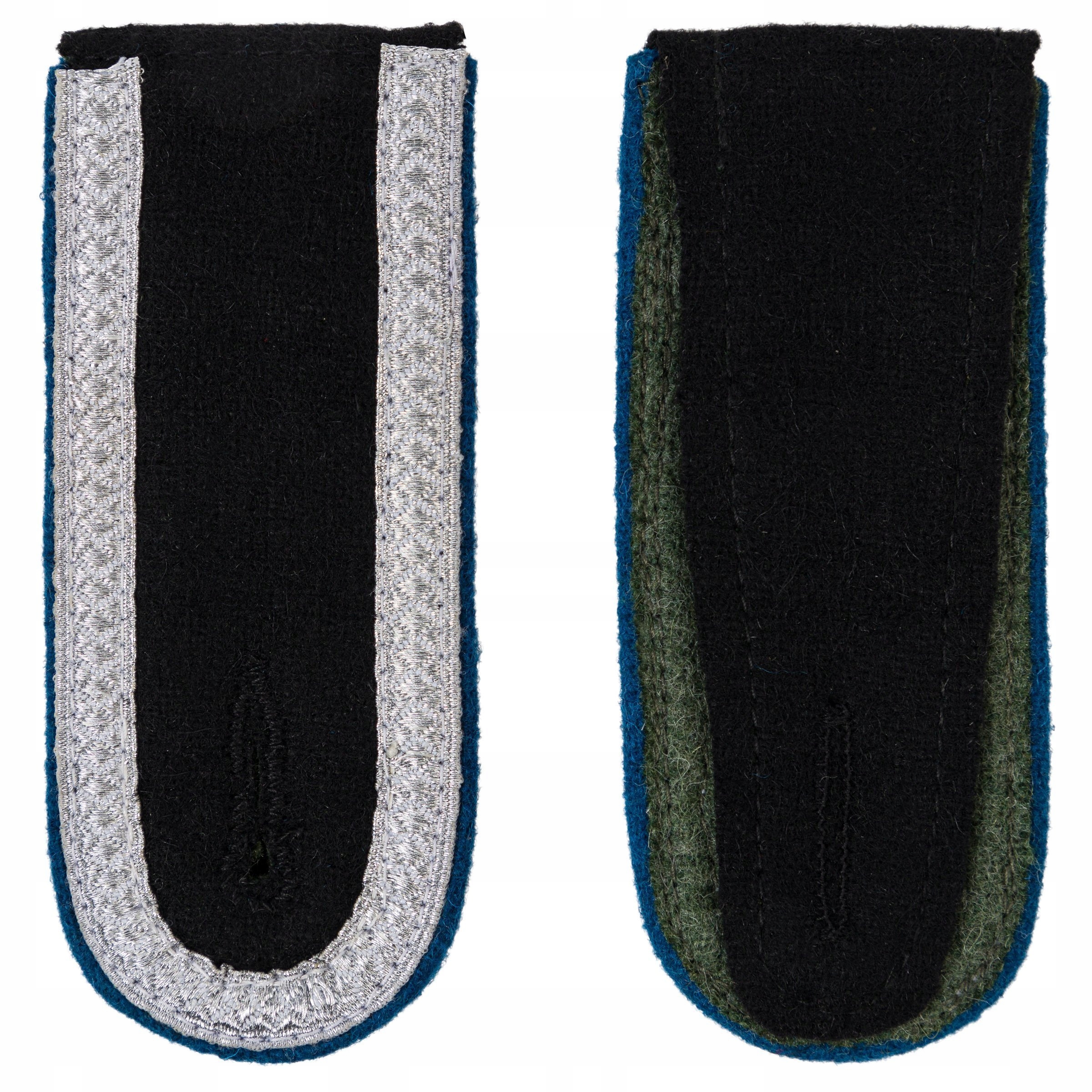 Точная копия погон унтер-офицеров звания унтершарфюрер. Погоны выполнены из черной ткани, кайма – из натуральной шерсти. Погоны обшиты унтер-офицерской лентой - идеальная копия, соответствует оригиналу.Погоны имеют синий ободок (медицинская служба).