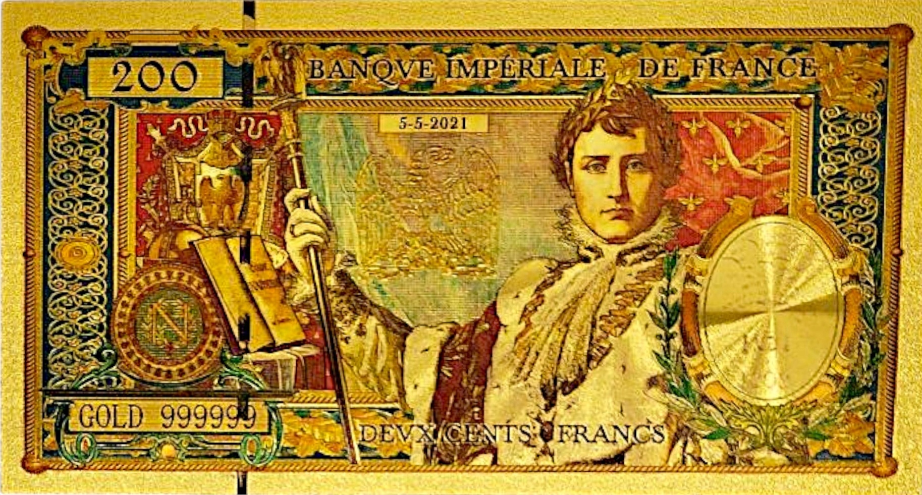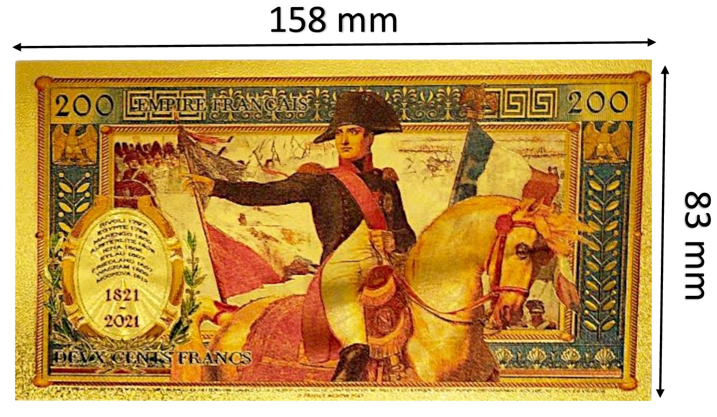 Уникальная коллекционная банкнота из прочного ПВХ, покрытая металлизированной золотой фольгой, с изображением легендарного Наполеона Бонапарта. Этот дизайн посвящен 200-летию со дня его смерти (1821–2021 гг.) и выполнен в стиле бывшей имперской банкноты Франции.