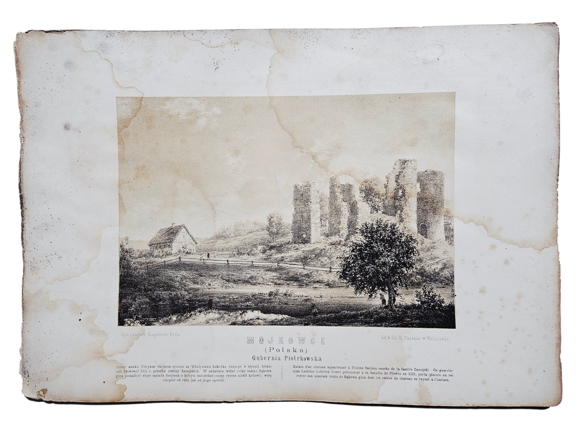 Вид на руины замка в Мойковце, работы Наполеона Орды. Бумага с характерными следами влаги – многочисленными пятнами цвета и тенями в углах. Заметный изгиб и волнистость края. Центральный рисунок разборчив.