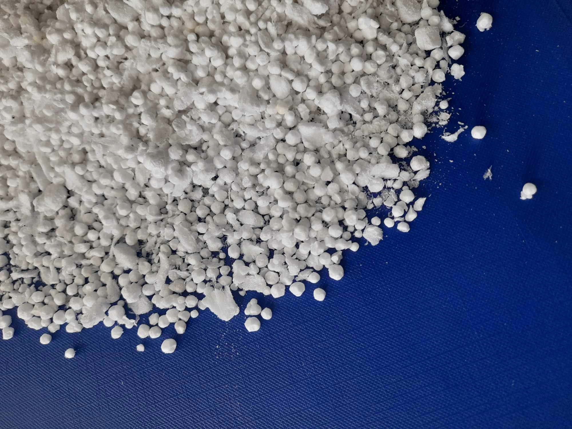 Регранулят производится из измельченного пенополистирола и не содержит примесей. Упакован в пакет и картонную коробку.