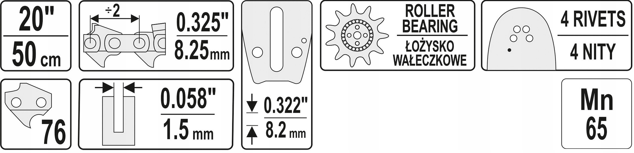 Длина 20", 76 звеньев, шаг 0.325", ширина 0,058" (1,5 мм).