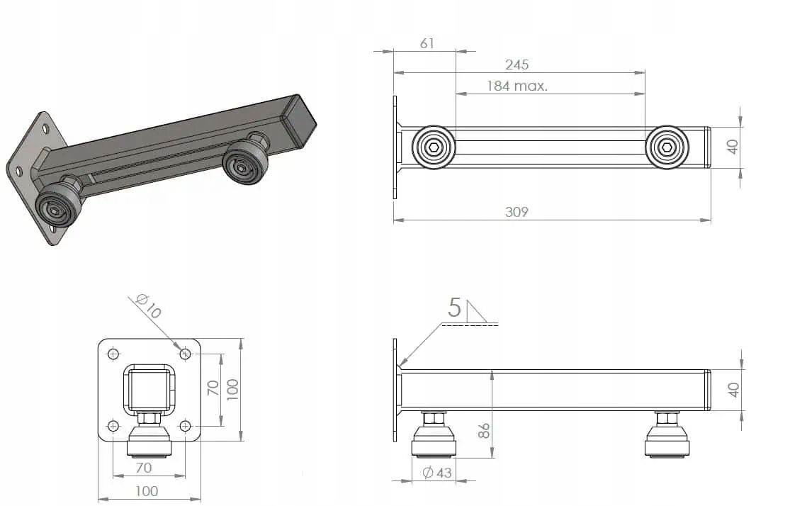 Стальной элемент – Регулируемая верхняя направляющая для самонесущих откатных и рельсовых ворот. Имеет два ролика из черного пластика, которые можно регулировать. Задача верхней направляющей – стабилизировать ворота в вертикальном положении при их движении между роликами этого элемента. Направляющая предназначена для ворот, отделанных в верхней части закрытым профилем простой формы без выступающих декоративных элементов. Изделие оцинкованное, крепится к стене.