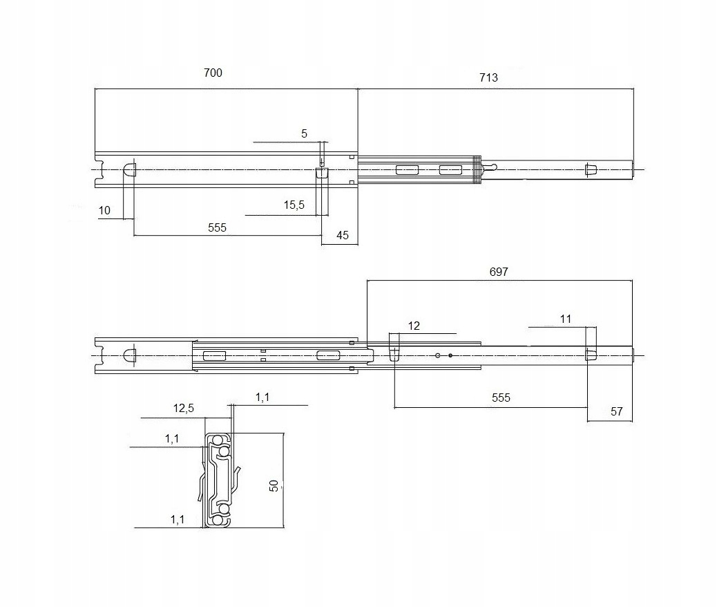Шариковая направляющая для металлической мебели с полным выдвижением и байонетным креплением, длина700ммс допустимой нагрузкой80 кгмарка HAKNER b> b>