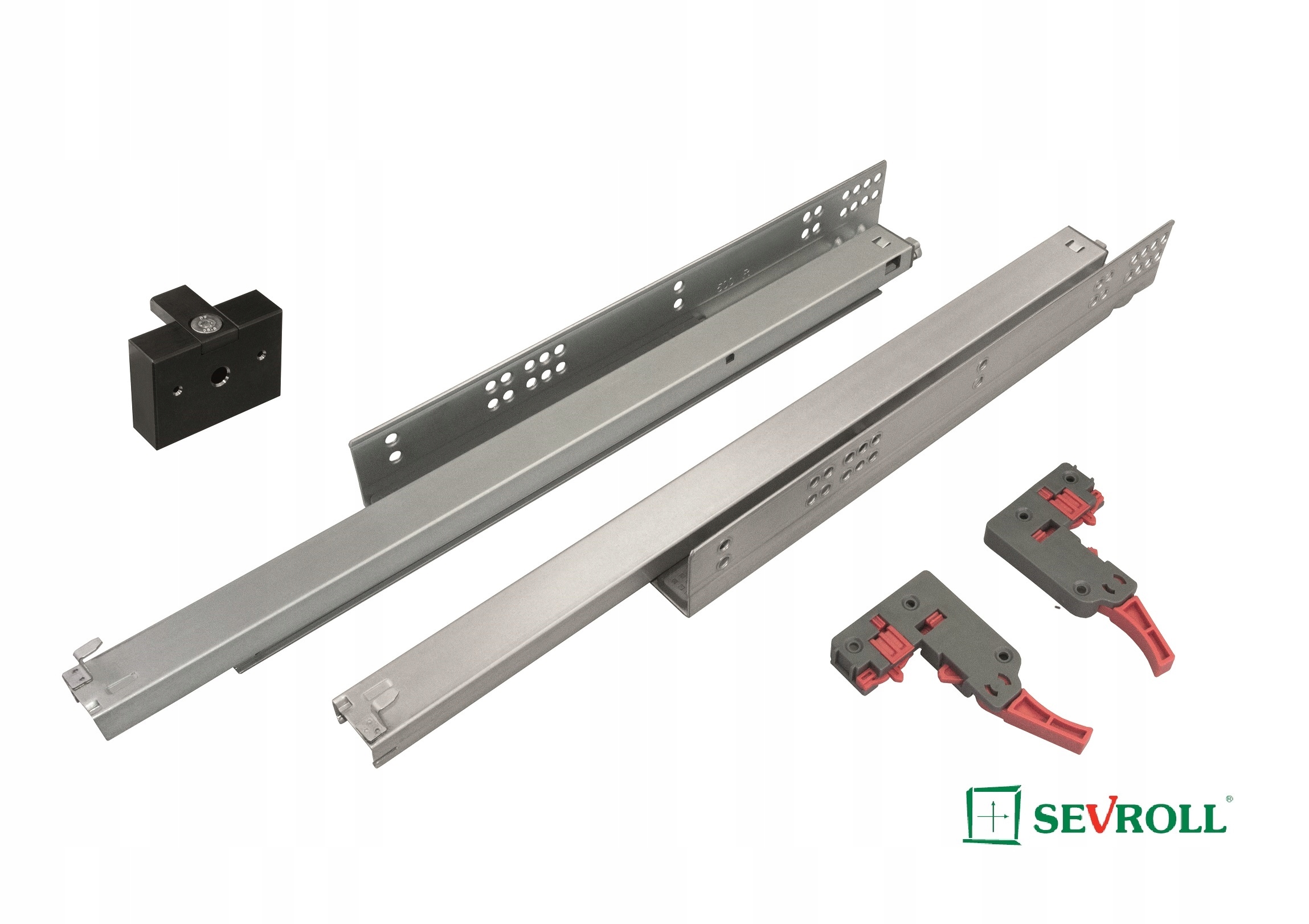 Нижняя монтажная направляющая известного брендаSEVROLL отличаетсяполным выдвижением,бесшумным закрыванием и регулировкой в трех плоскостях.