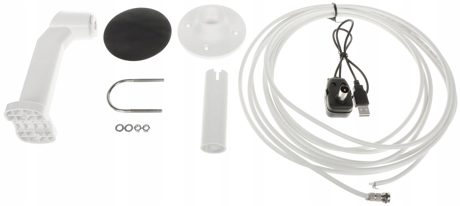 - Антенный кабель + разъем F, разделитель антенны + разъем IEC, кабель питания + разъем USB-A, основание для крепления антенна, Крепление к мачте, U-образный болт в комплекте.