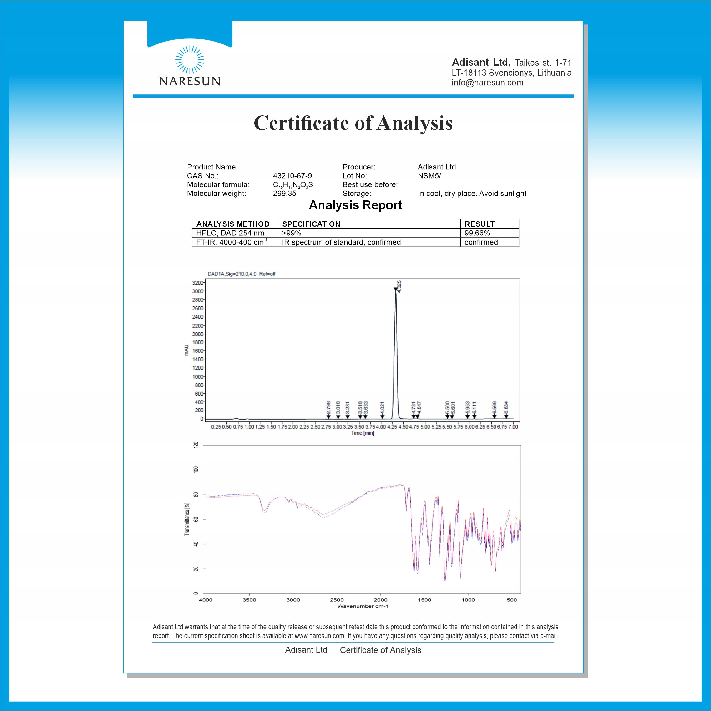 Чистый препарат, содержащий фенбендазол, произведенный в европейской лаборатории, имеющий сертификат качества. Фенбендазол НАРЕСУН характеризуется чистотой более 99%. Каждая партия фенбендазола имеет индивидуальный сертификат качества. Продукт NARESUN не содержит наполнителей, увеличивающих объем порошка, ни в самом порошке, ни в продаваемых капсулах.