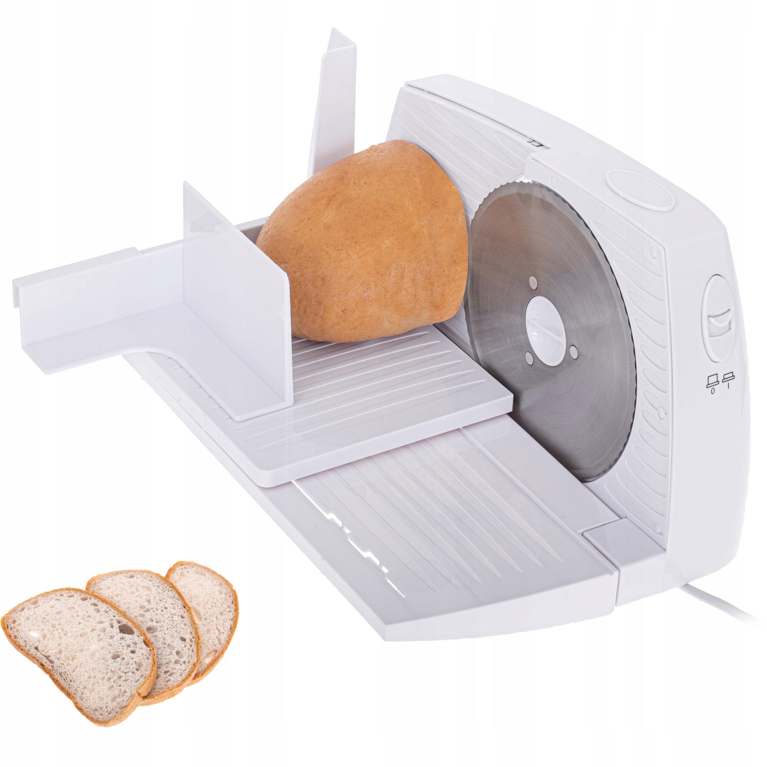 Компактный, безопасный, складной нож. Со съемным толкателем. Прочный пластик, из которого он изготовлен, облегчает переноску. Высококачественное лезвие из нержавеющей стали диаметром 170 мм позволяет нарезать мясо тонкими ломтиками, а также нарезать цельный ломтик деревенского хлеба. Толщину резки можно легко регулировать. Все это легко разбирается на элементы, что упрощает чистку. Он занимает очень мало места. Благодаря возможности складывания, после окончания раскроя его можно положить в шкаф. Кнопка безопасности защищает от случайного включения. Пластиковая скользящая пластина также предназначена для защиты пальцев от порезов. Резиновые ножки предотвращают перемещение слайсера.