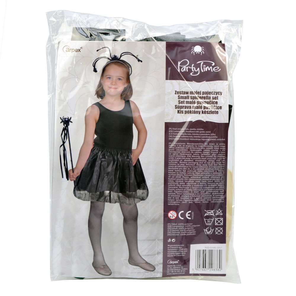 Костюм на Хэллоуин для девочки - паучок. В комплект входит черная юбка, повязка на голову с пауком и палочка. Двухслойная юбка из тонкого флизелина. На талии резинка, поэтому размер универсальный. Окружность от 60 до 75 см. Длина более длинного слоя юбки составляет примерно 30 см. Длина более короткого слоя составляет примерно 22 см. Наряд дополняет черный пластиковый ободок, украшенный черным пауком из помпонов и креативной проволоки. У паука прикреплены два подвижных глаза. Паук сможет творить магию с помощью палочки. Черная палочка обернута лентой. На конце у него прикреплен паук из пенопласта с подвижными глазами. Палочка декорирована 4 лентами длиной примерно 25 см.