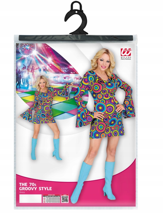 Идеальный костюм для сумасшедшей вечеринки в атмосфере 70-х и 80-х годов. Платье выполнено из качественного яркого материала с яркими кольцами. Имеет длинные рукава, расклешенные внизу.